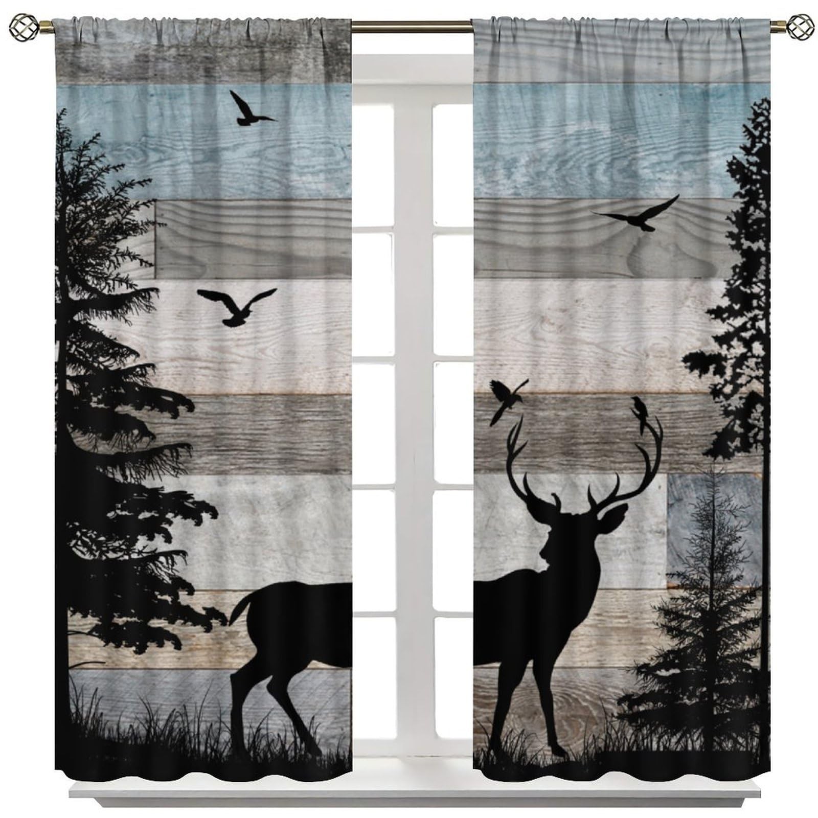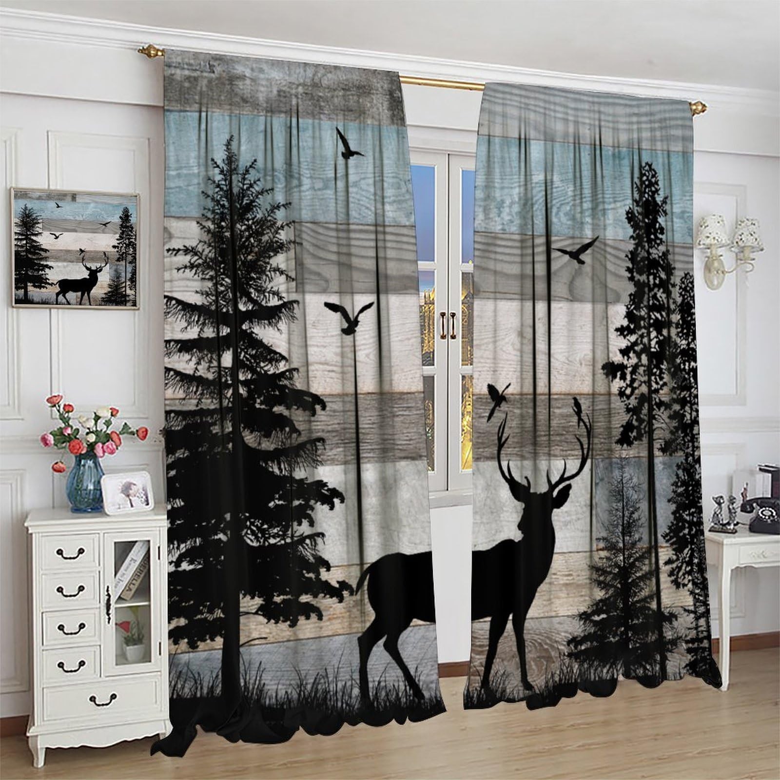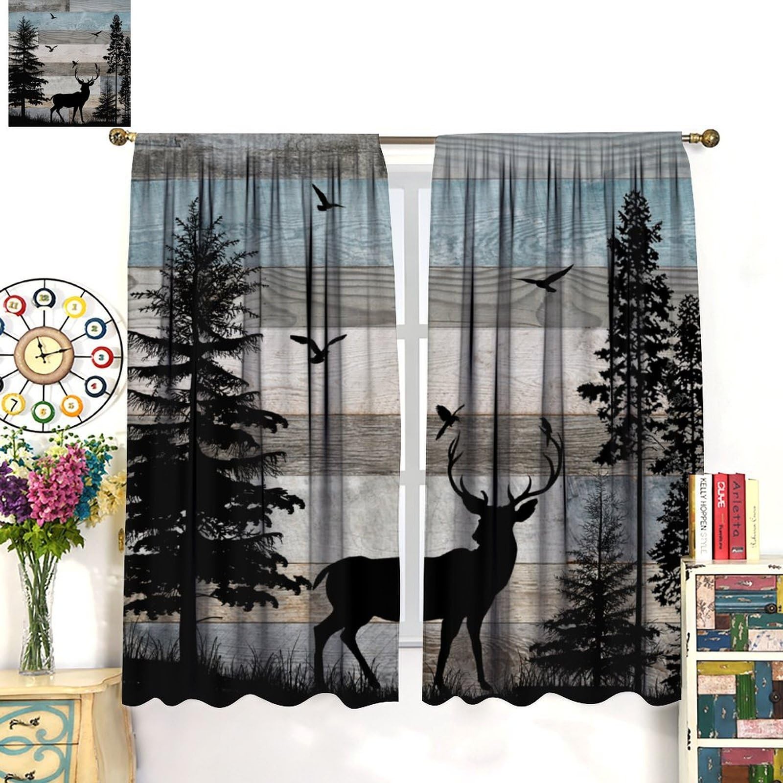 Rustic Deer Curtains, Retro Cabin Farmhouse Country Lodge Blue Brown Wooden B...