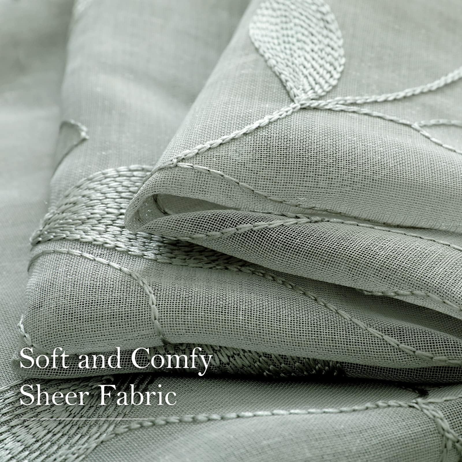 Sage Green Sheer Curtains 52 X 63 Inches Length 2 Panels Embroidered Leaf Pat...