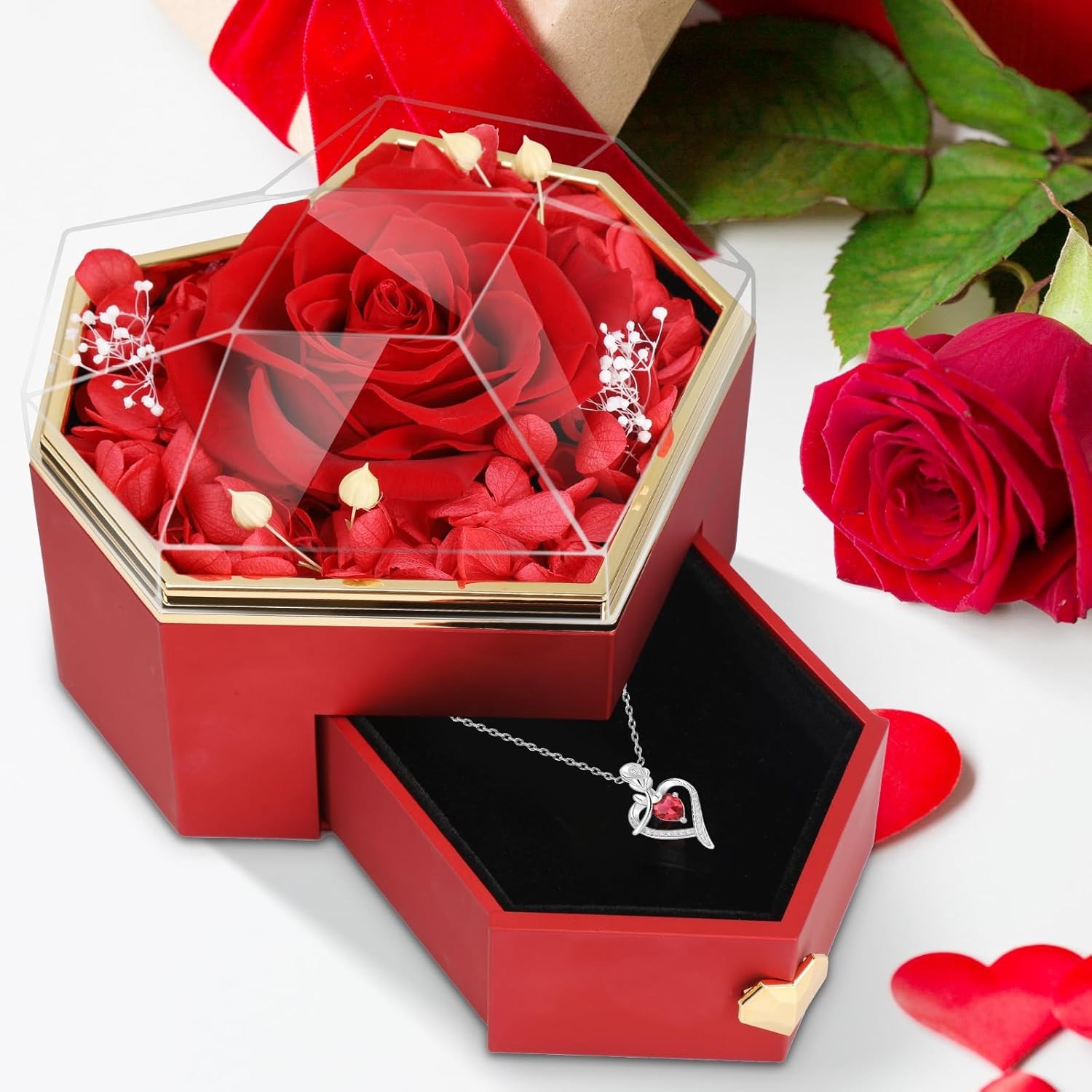 Included Components: 1 * Greeting Card, 1 * Necklace Pendant, 1 * Preserved Red Rose,