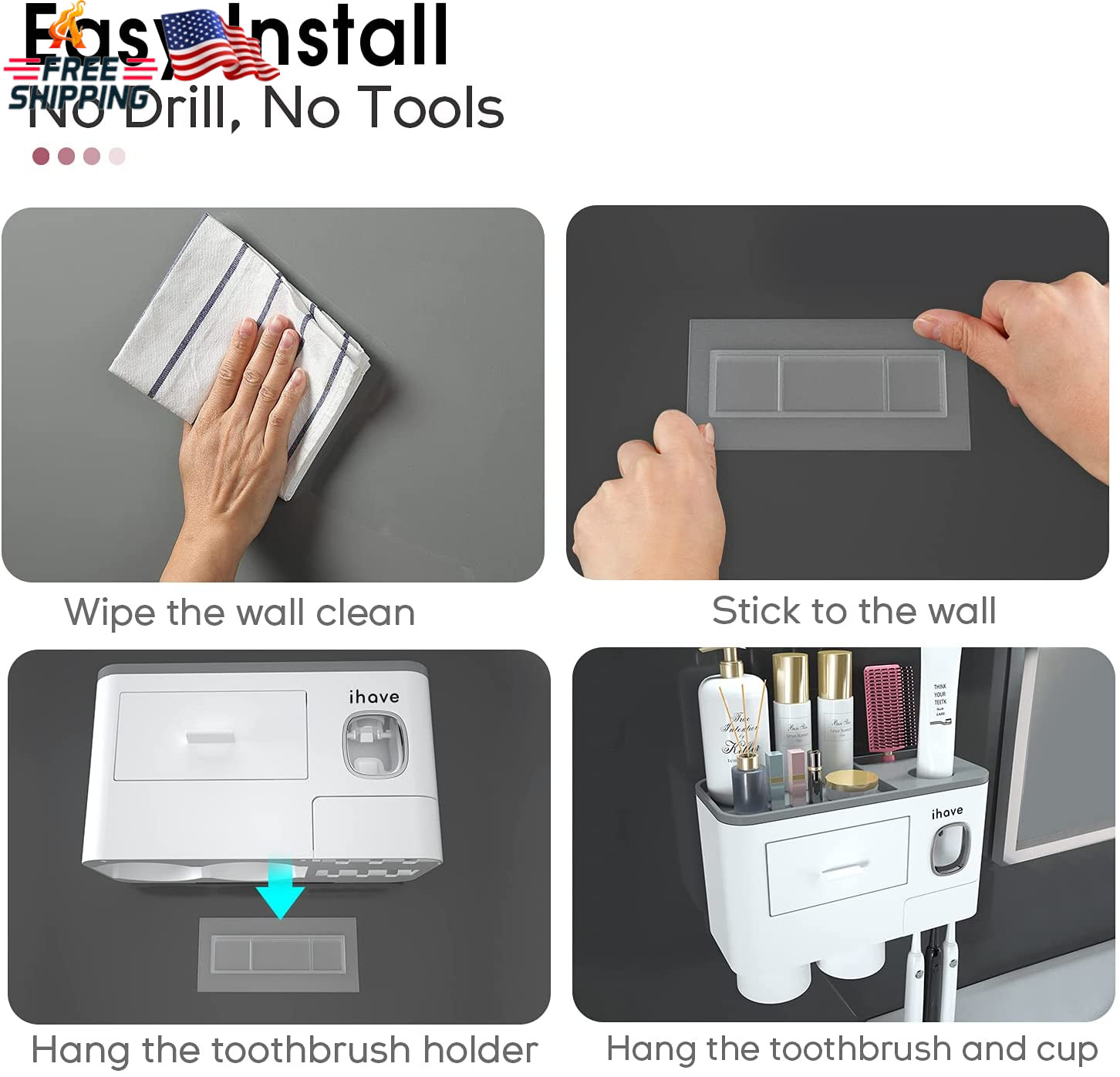 Wall Mounted Toothbrush Holder 2 Cups Toothpaste Dispenser Bathroom