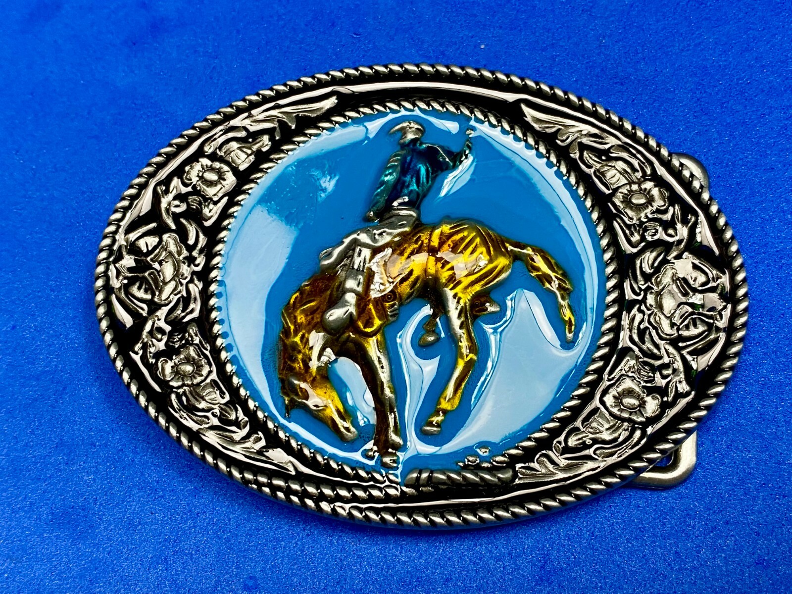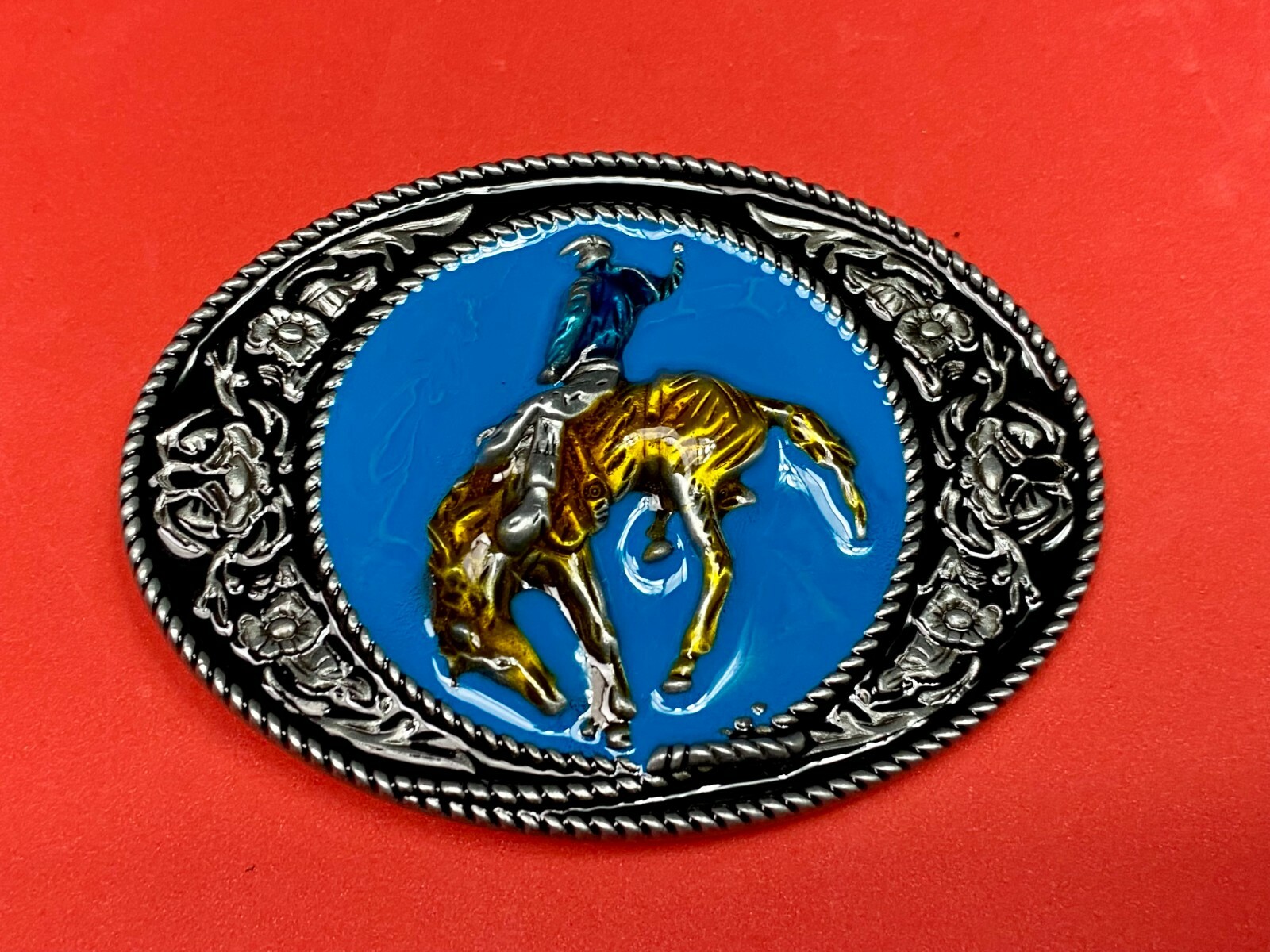 • Saddle bronc Western rodeo cowboy bucking horse ornate NOS belt buckle