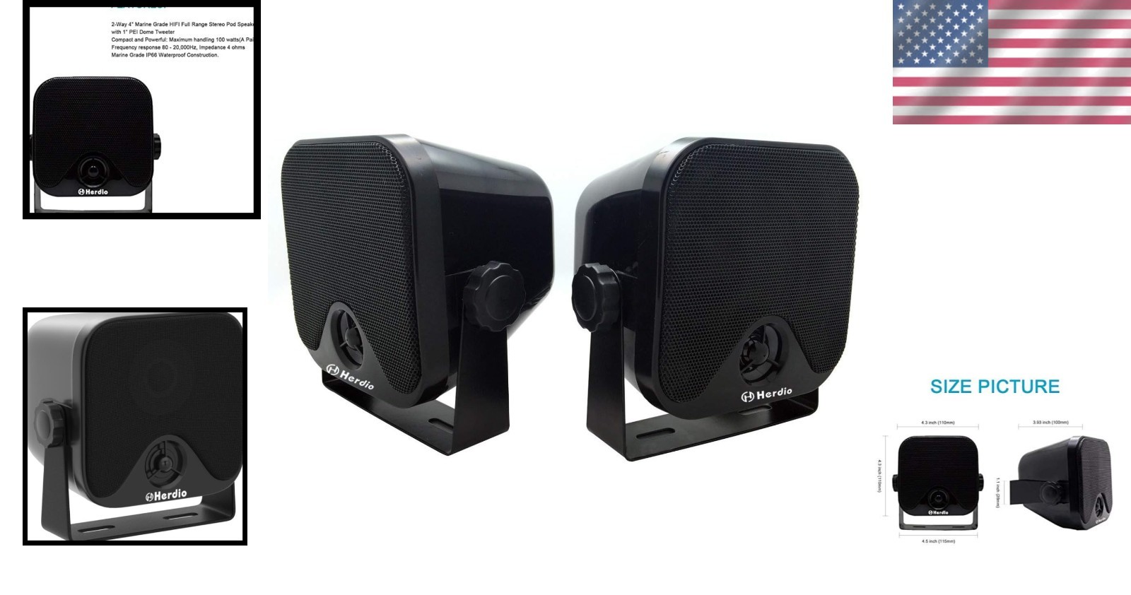 Особенности: Waterproof, Marine Grade, Compact Size, Full Range Stereo, 2-Way, Heavy Duty Construction, Marine Grade Construction, Rating, 2-Way 4" Design, HIFI Full Range, 1" PEI Dome Tweeter, Compact and Powerful Design, Maximum Handling 100 Watts, Impedance 4 Ohms, Easy Installation, Surface Mounted, Self-Contained Pod Speakers, Includes Mounting Brackets