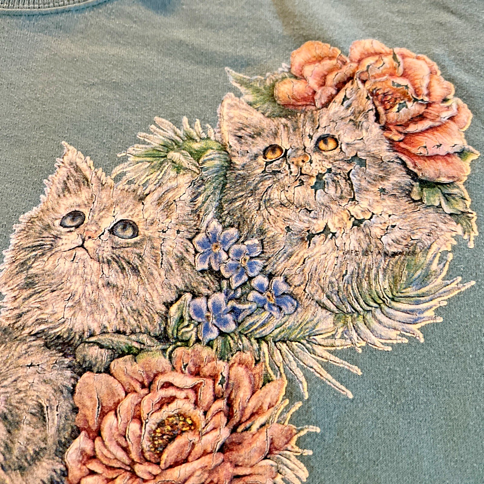 Vintage 90s Hanes Cat Sweatshirt XL Floral Kitten Grandmacore Crewneck