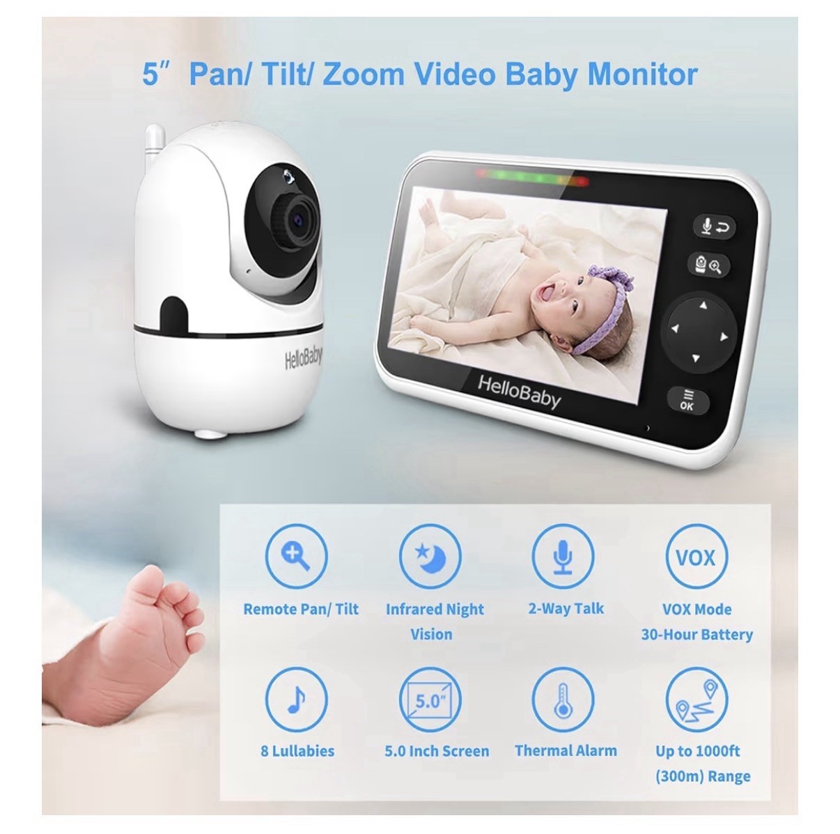 как выглядит HelloBaby No WiFi Baby Monitor HB6550 5" Screen 30-Hour Battery Pan-Tilt-Zoom фото