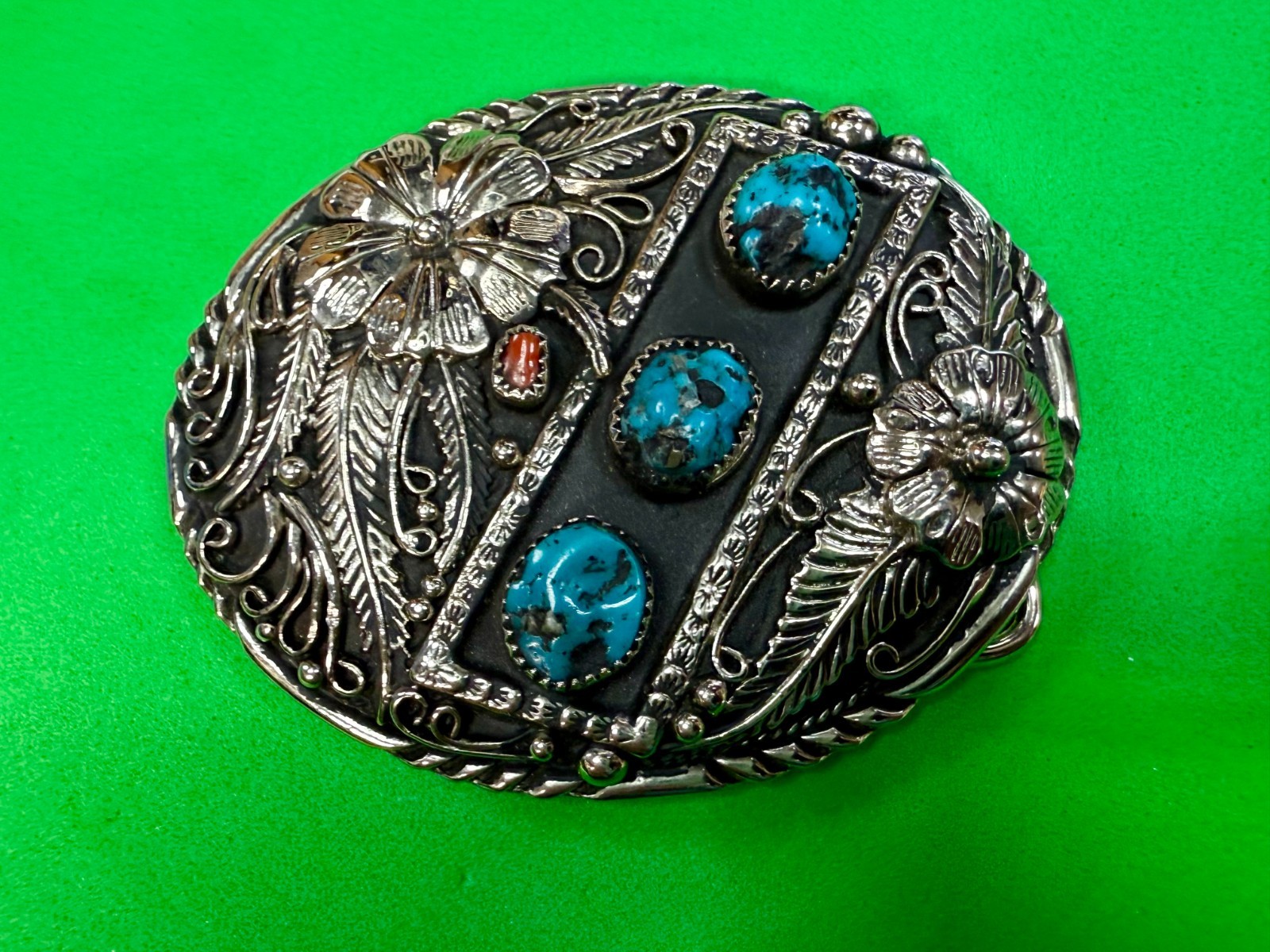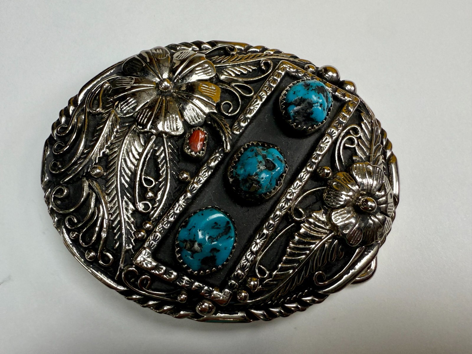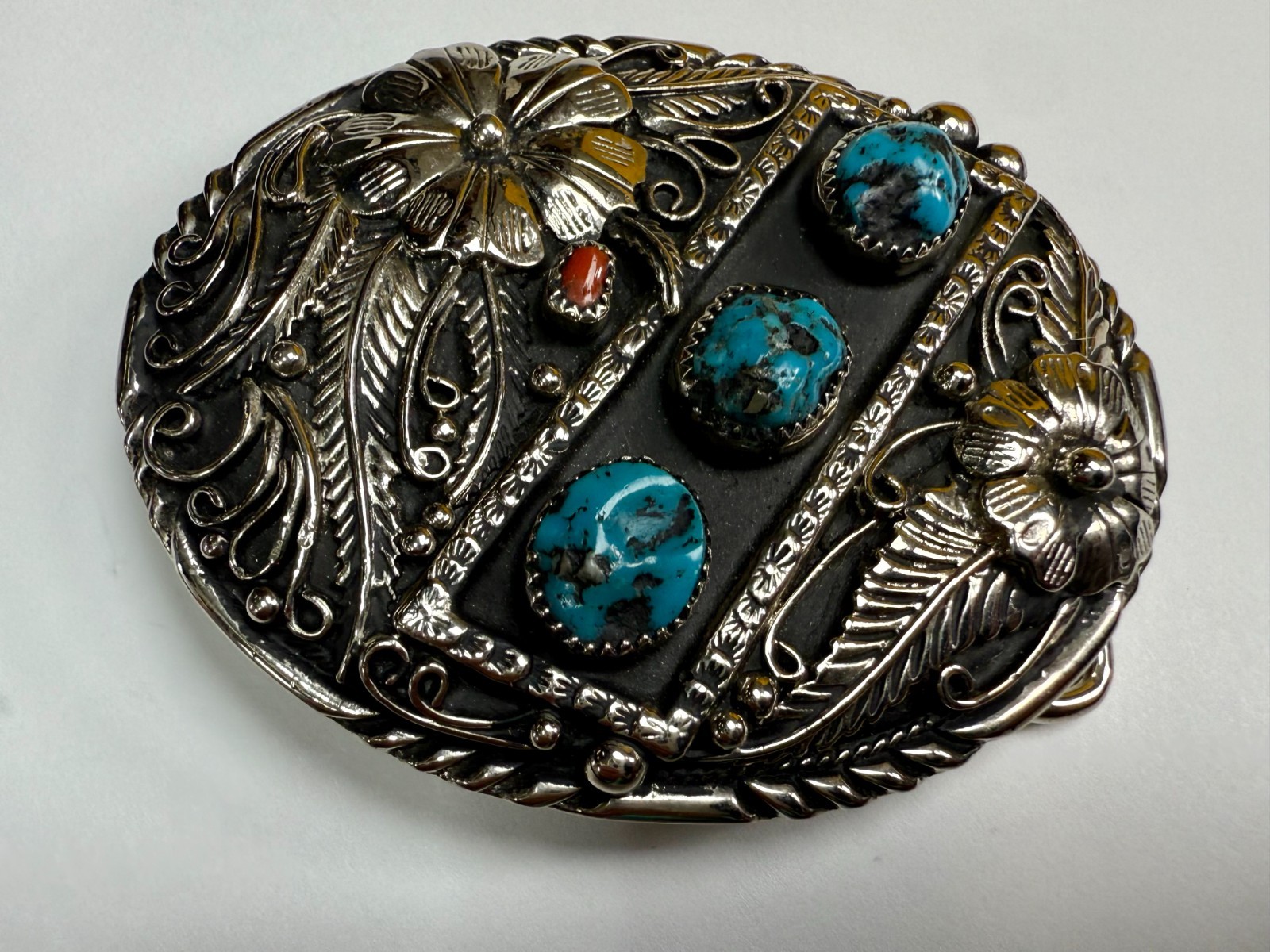 • Southwestern Flower Feather Turquoise Coral Stones SSI Handcrafted Belt Buckle