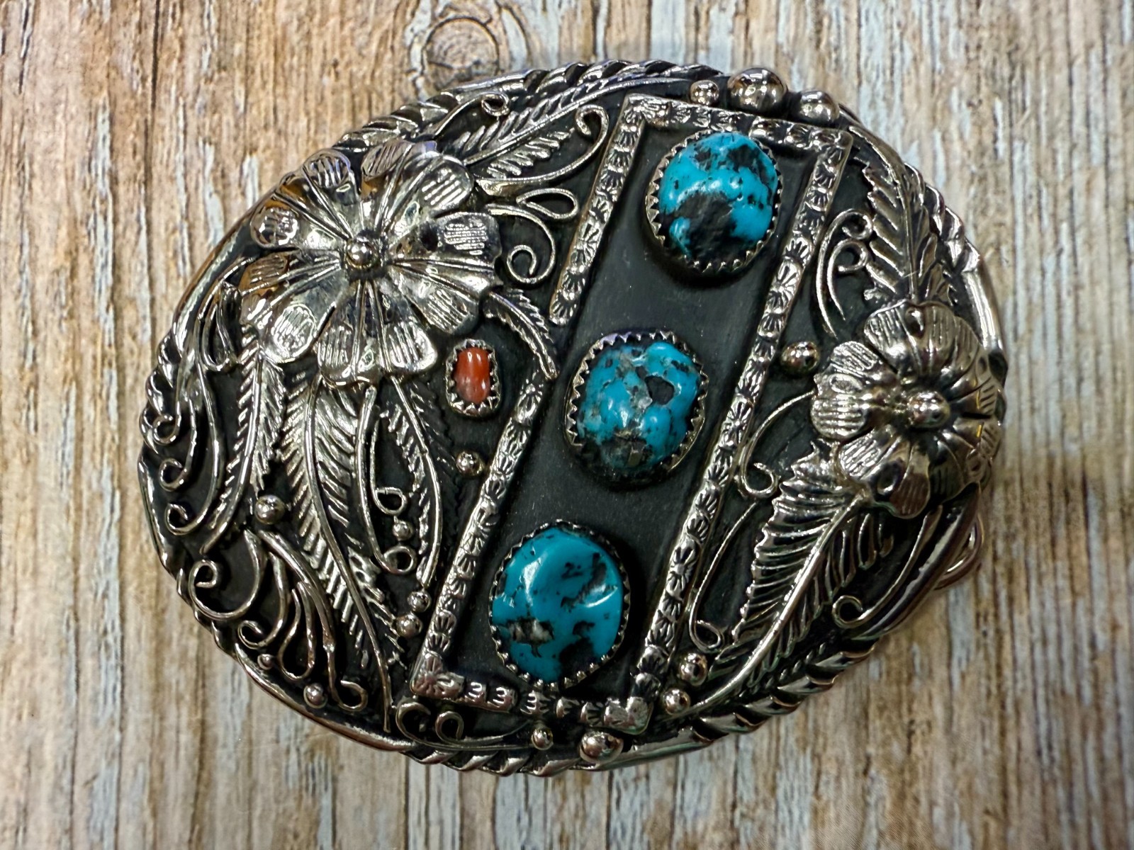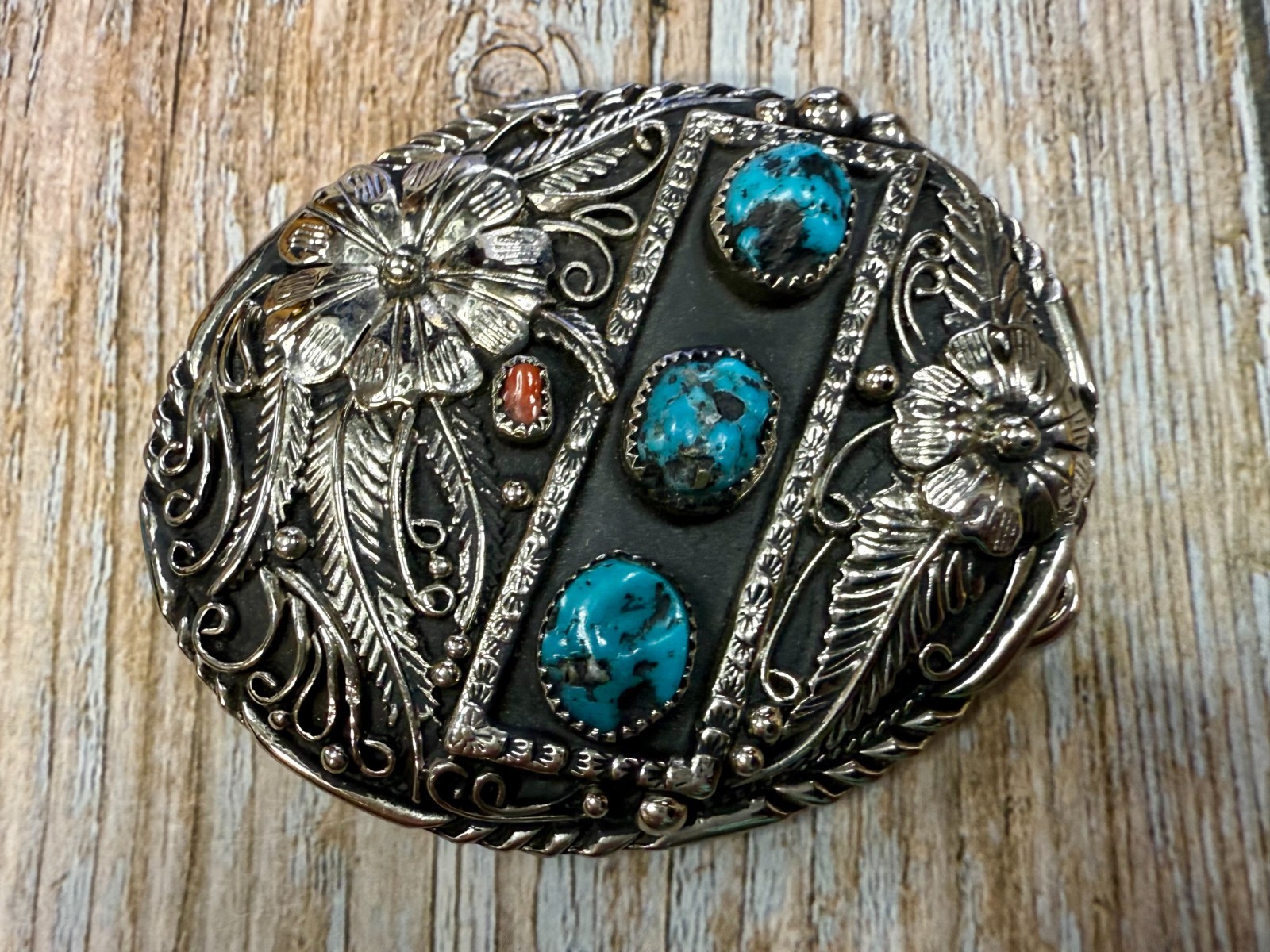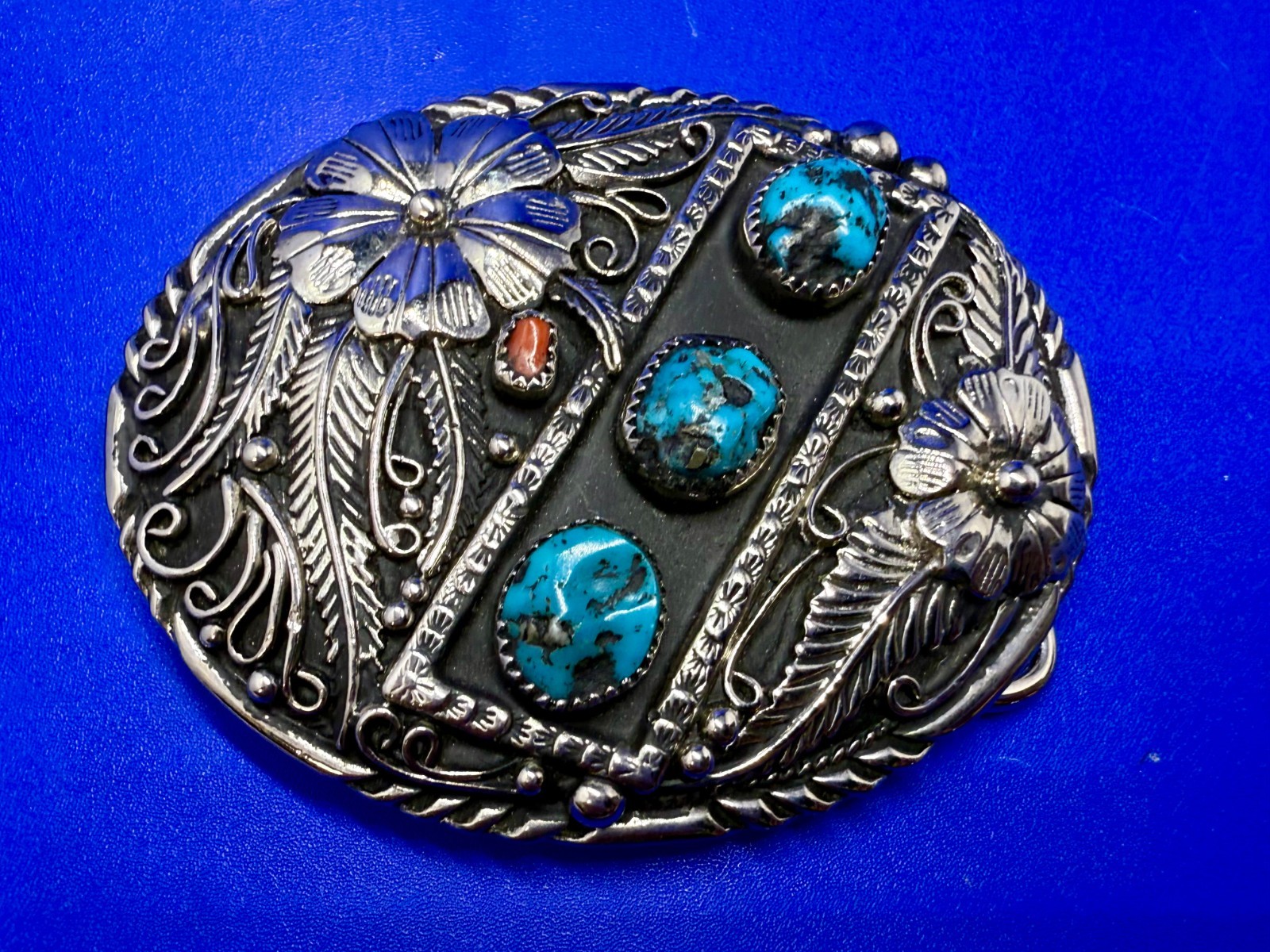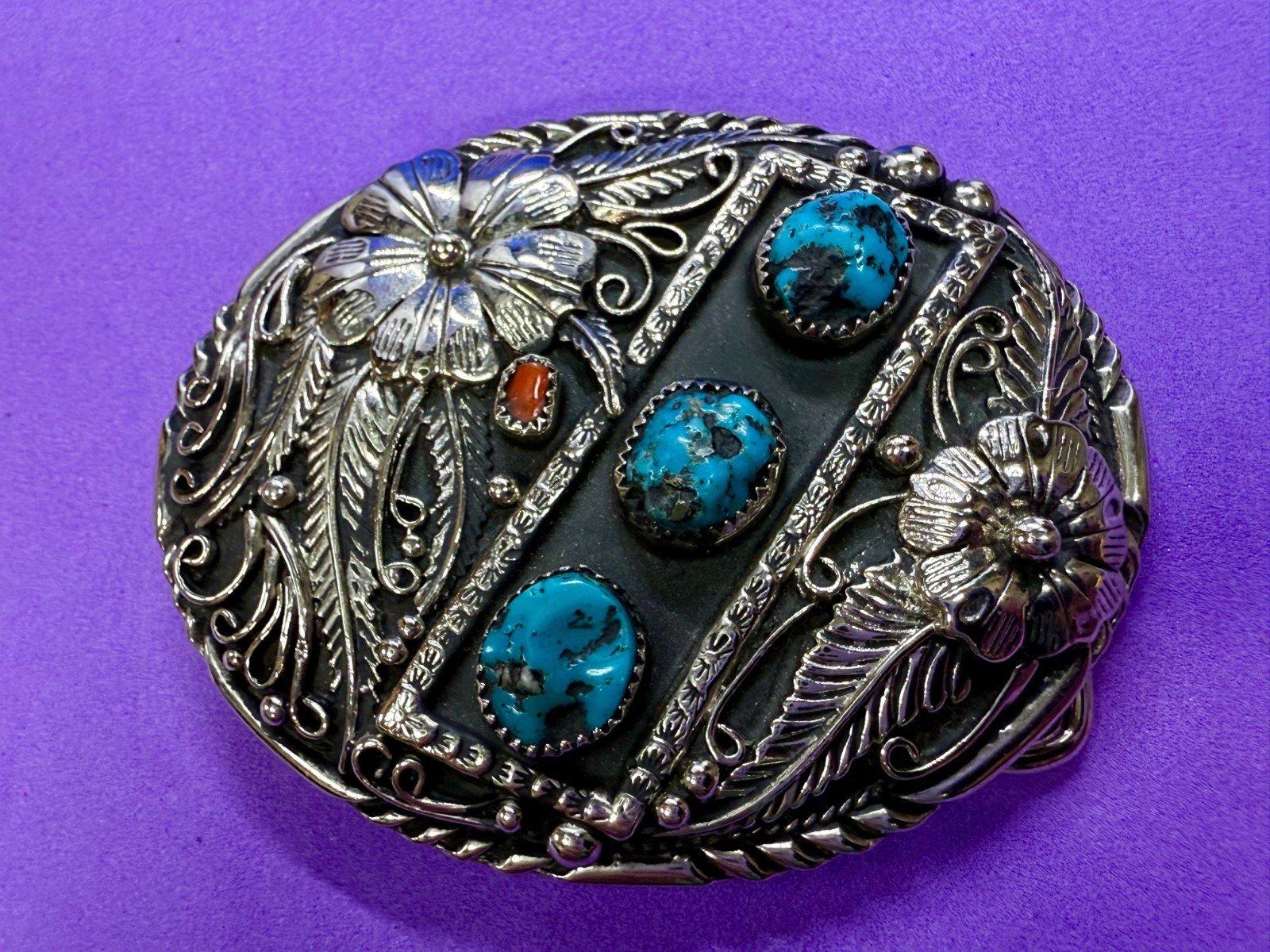 • Southwestern Flower Feather Turquoise Coral Stones SSI Handcrafted Belt Buckle
