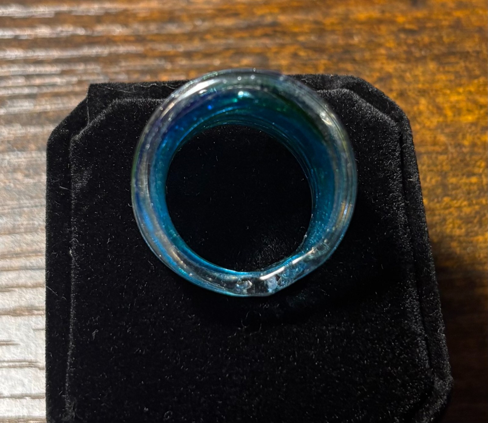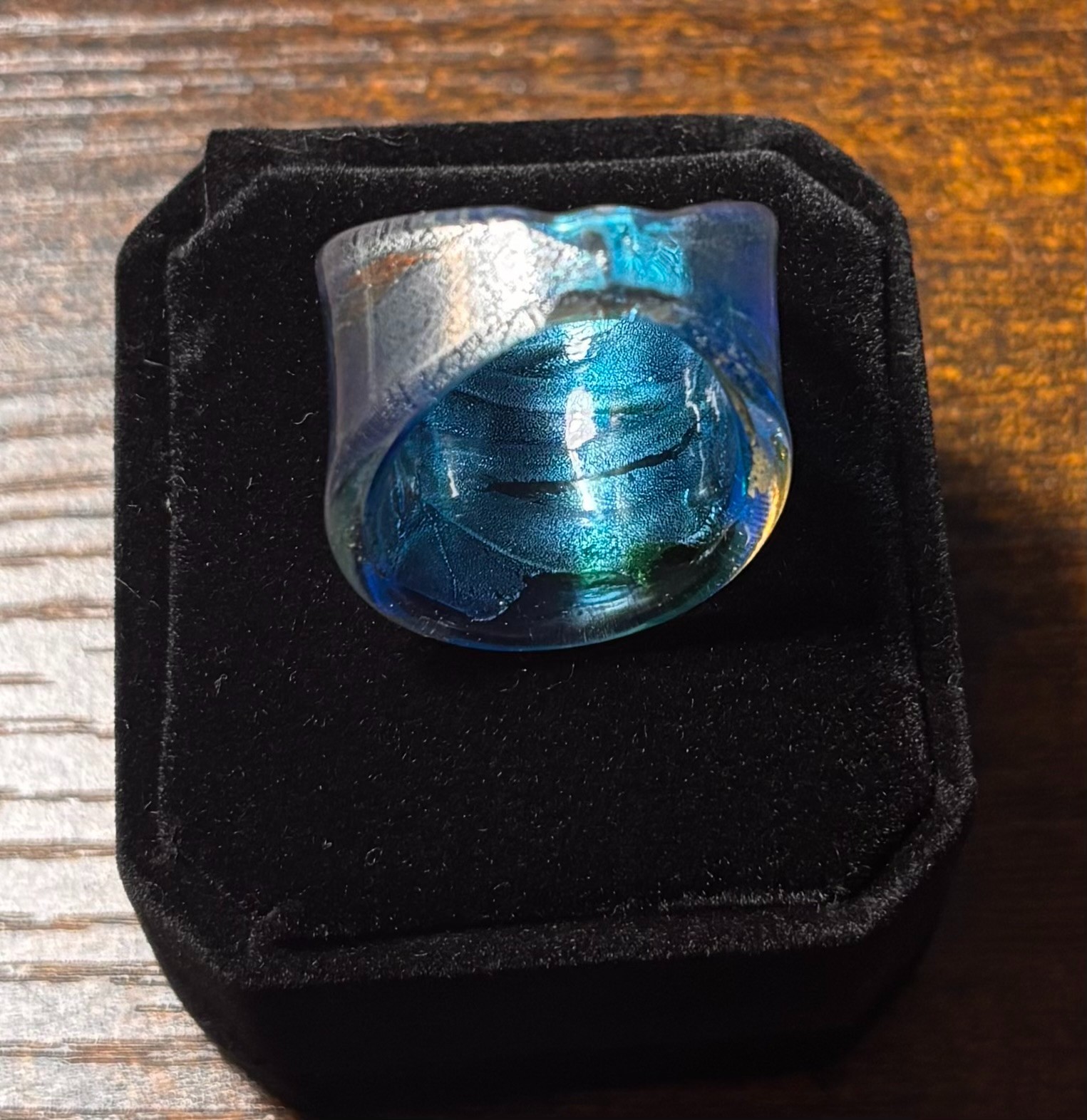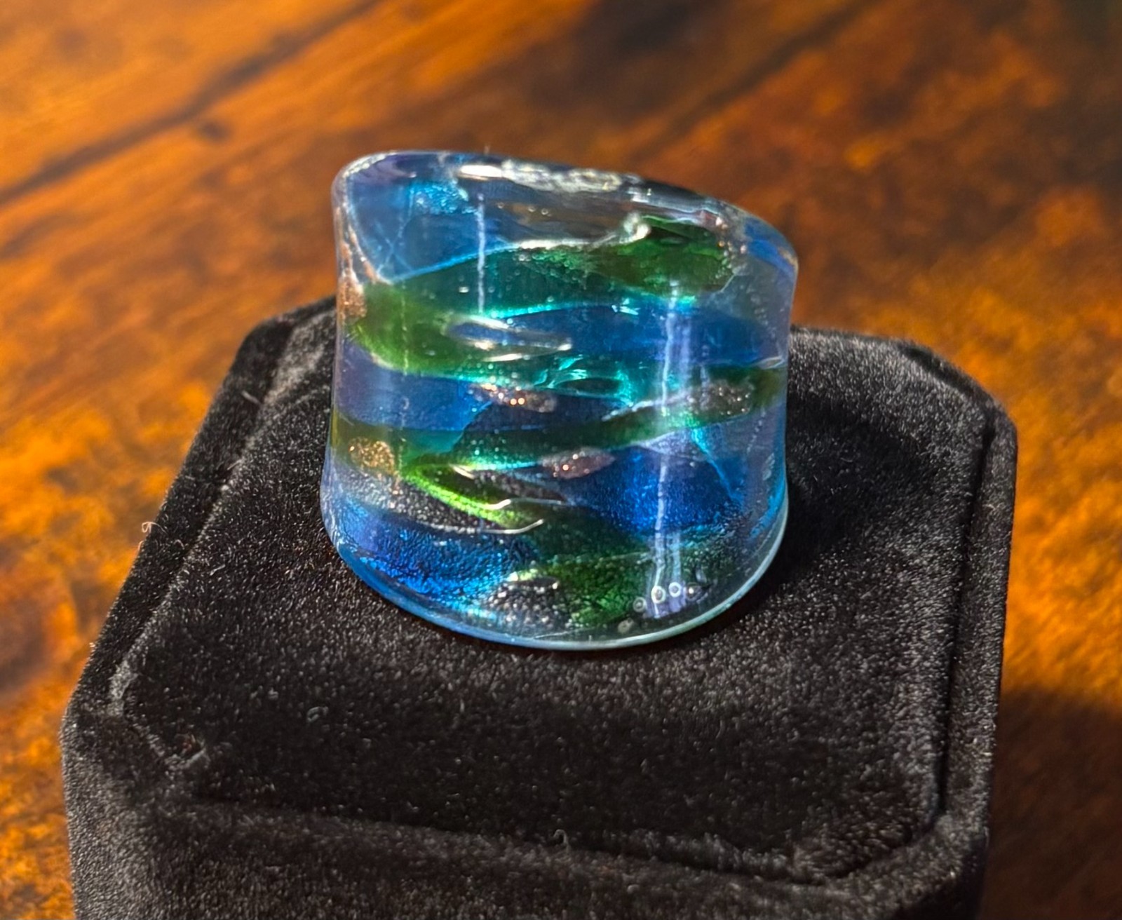 Vintage Murano Style Hand Blown Art Glass Ring Green, Blue, Foil Swirl Size 8.5