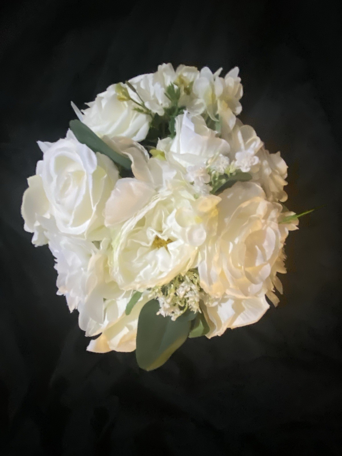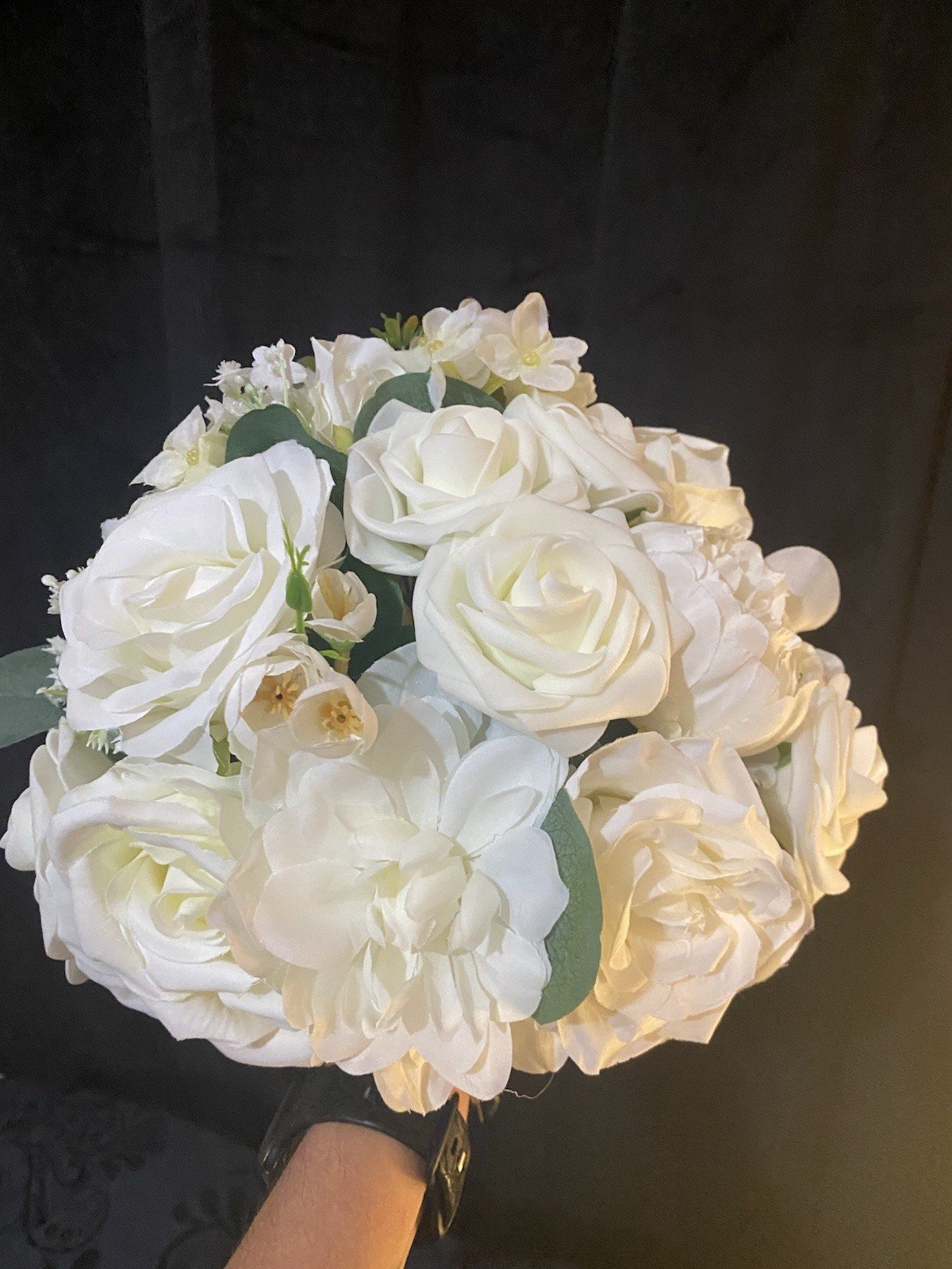 All White Mixed flower wedding Bouquet With Matching Boutonni re magnet