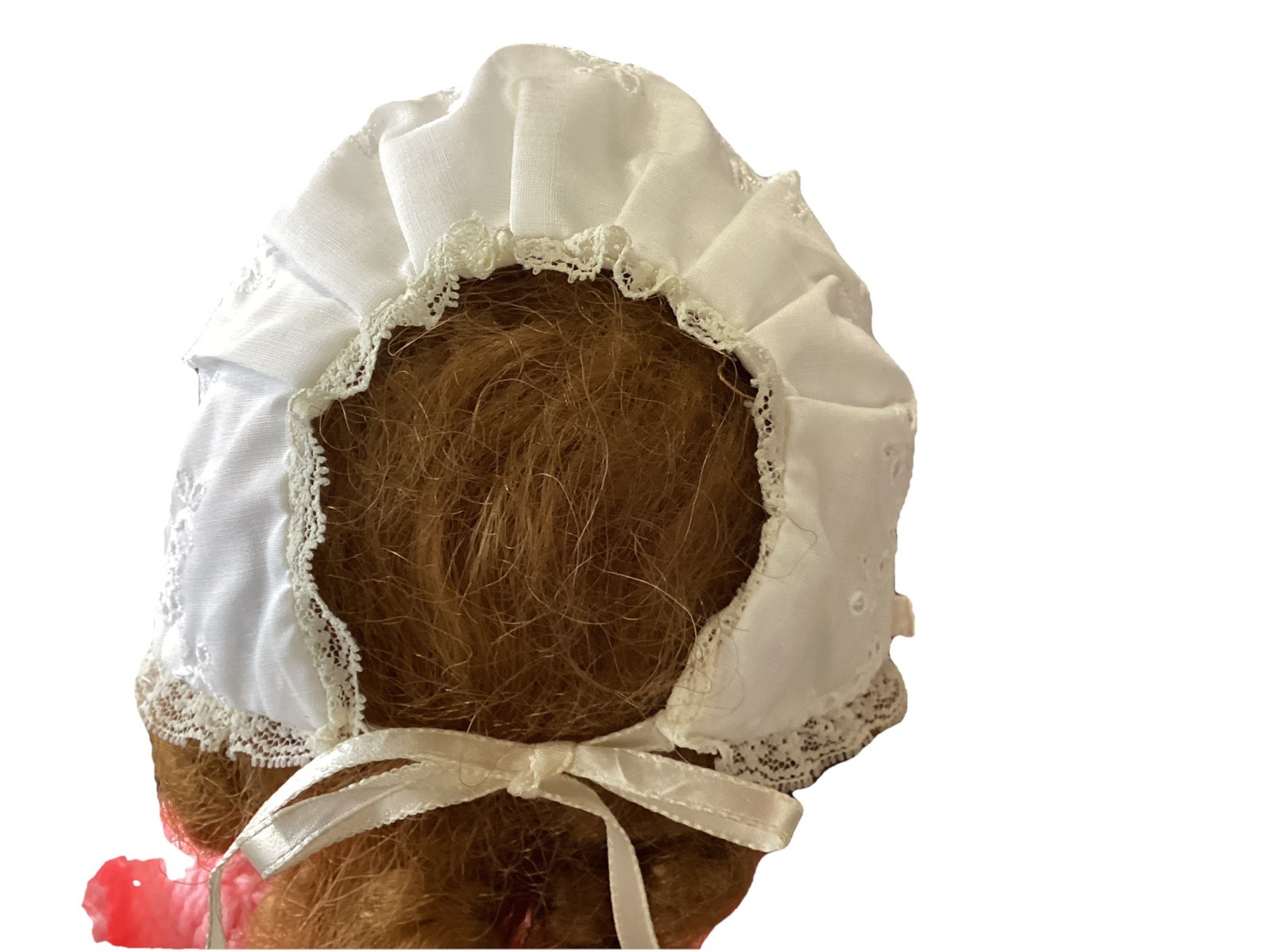 Vintage Handmade White Eyelet And Lace Baby Or Doll Bonnet