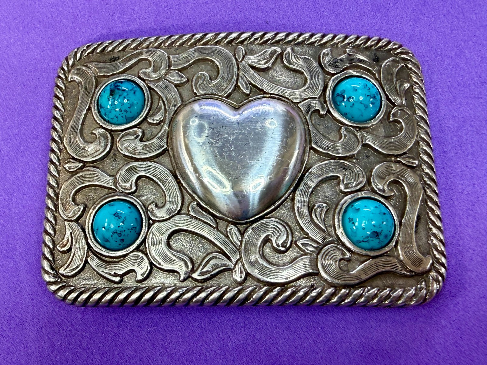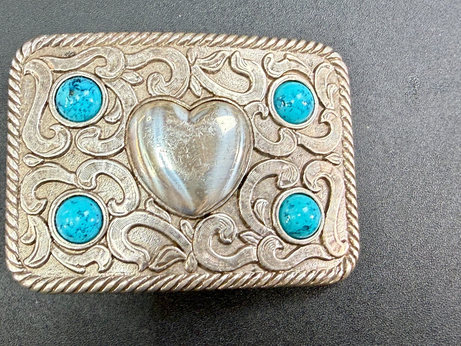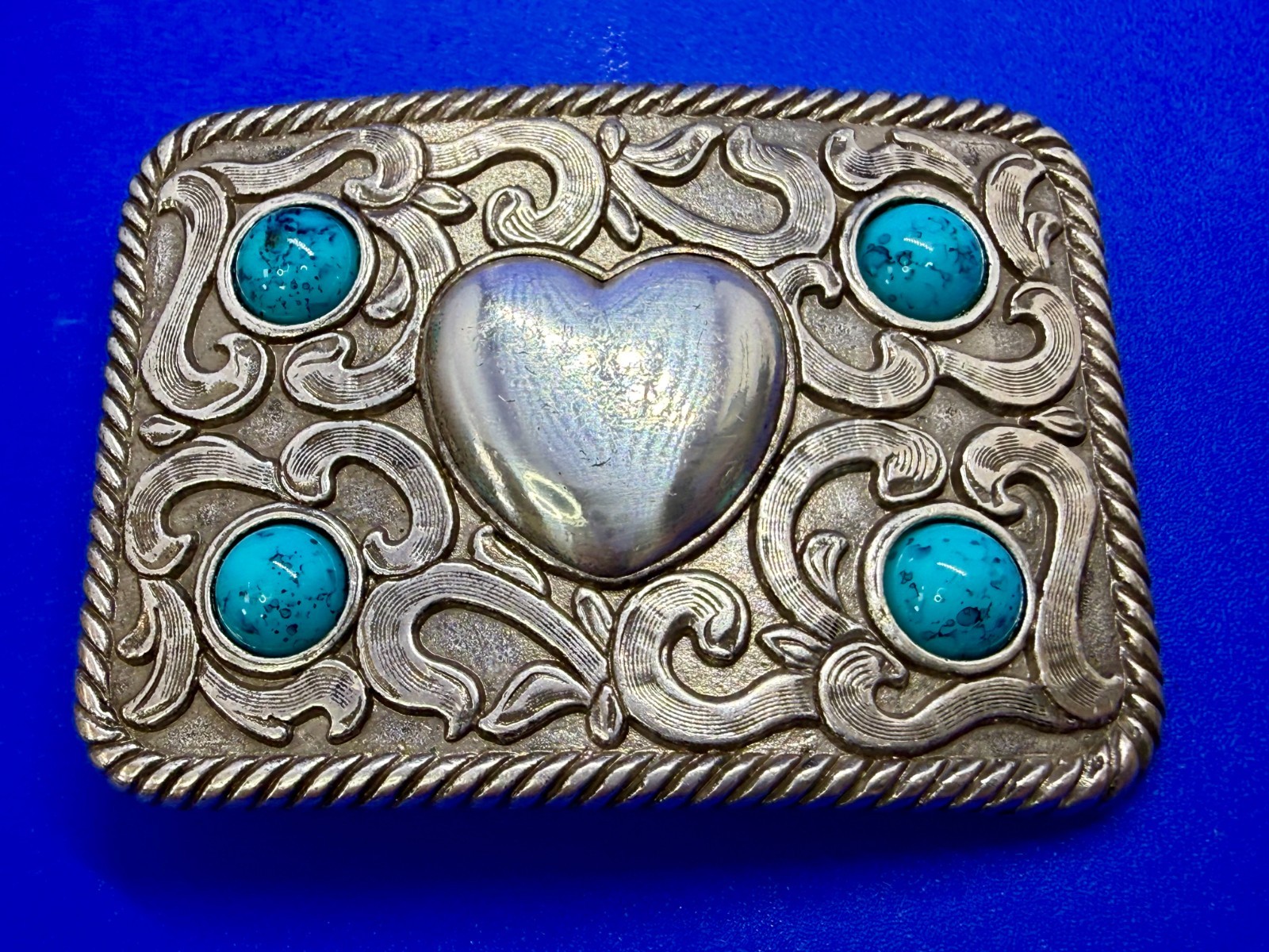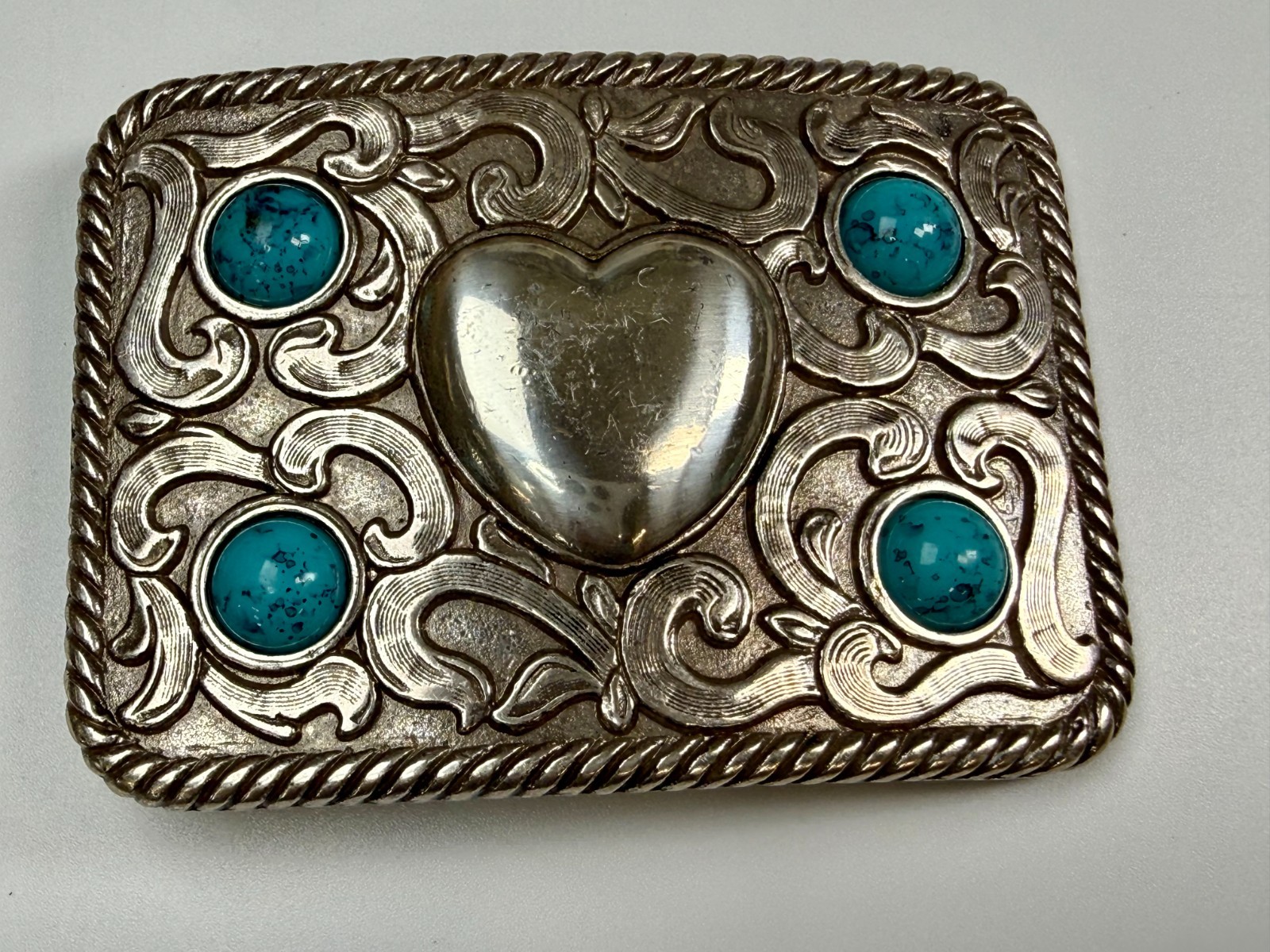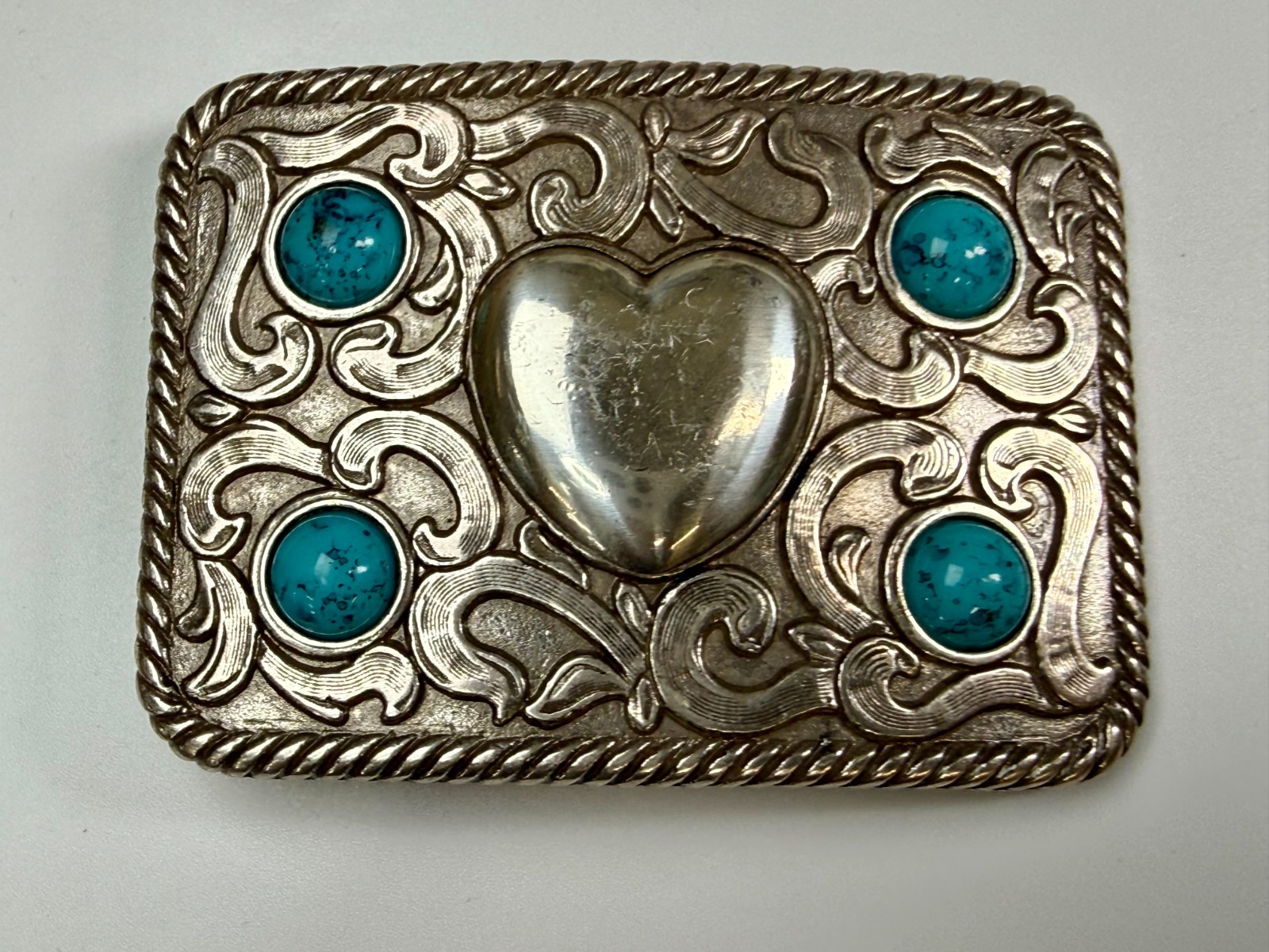 • Centered Heart Shaped Center With Four Turquoise Stone Accents Belt Buckle