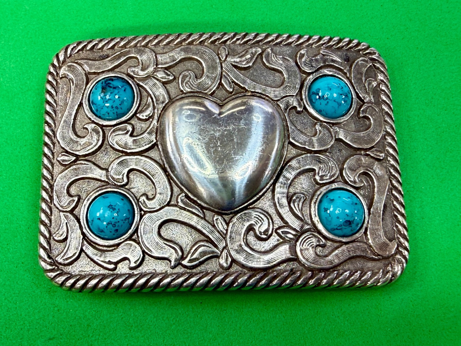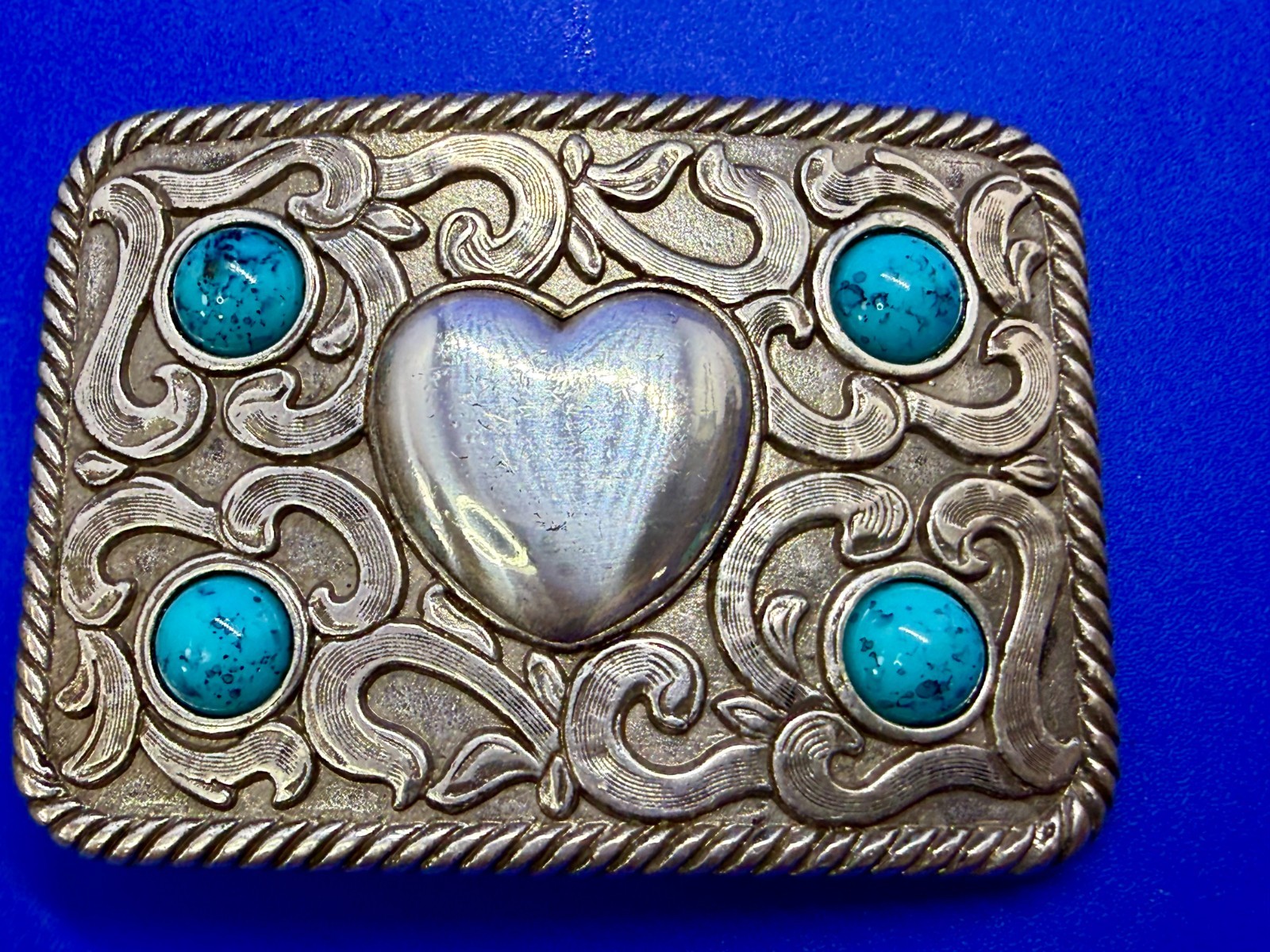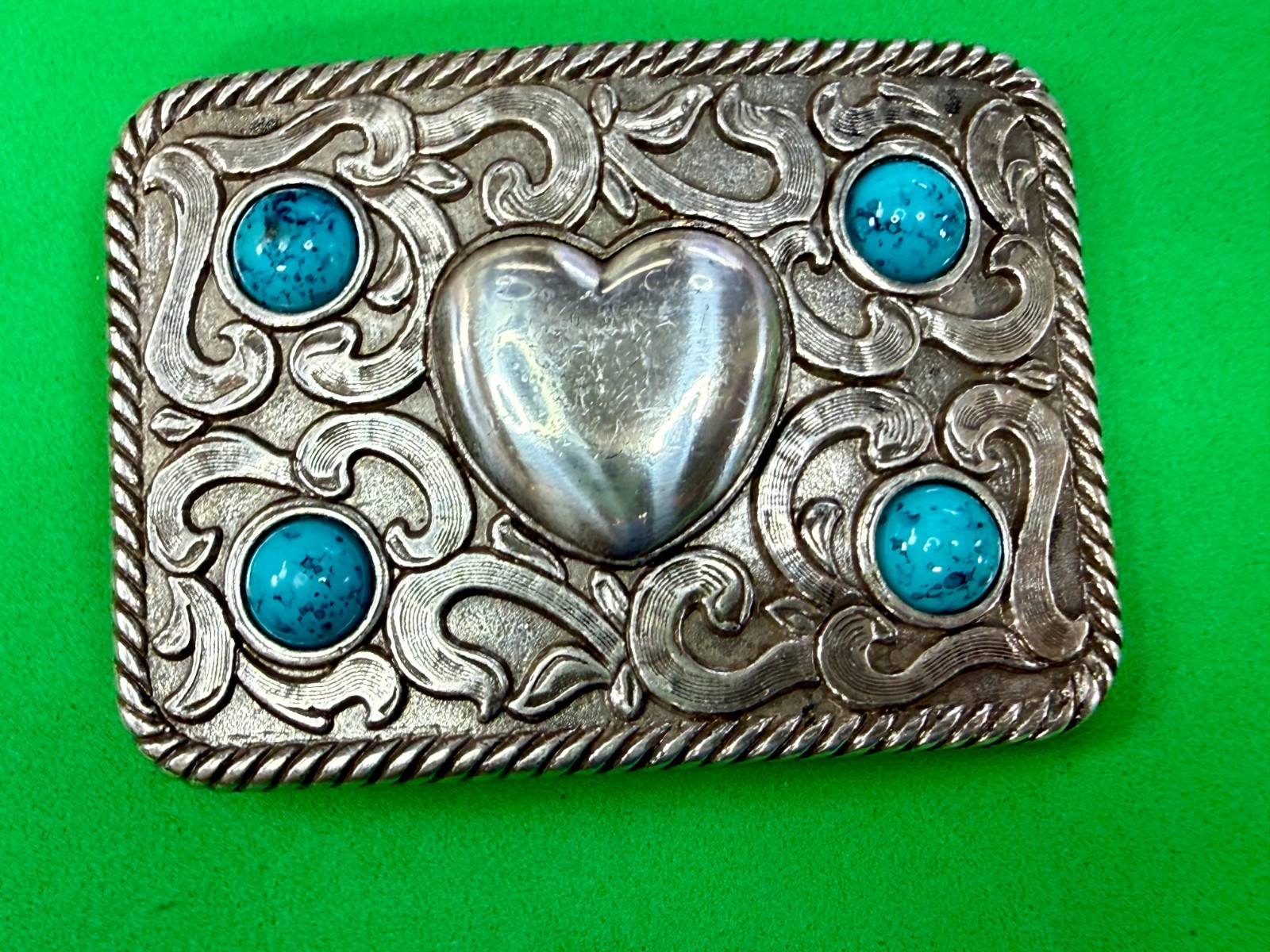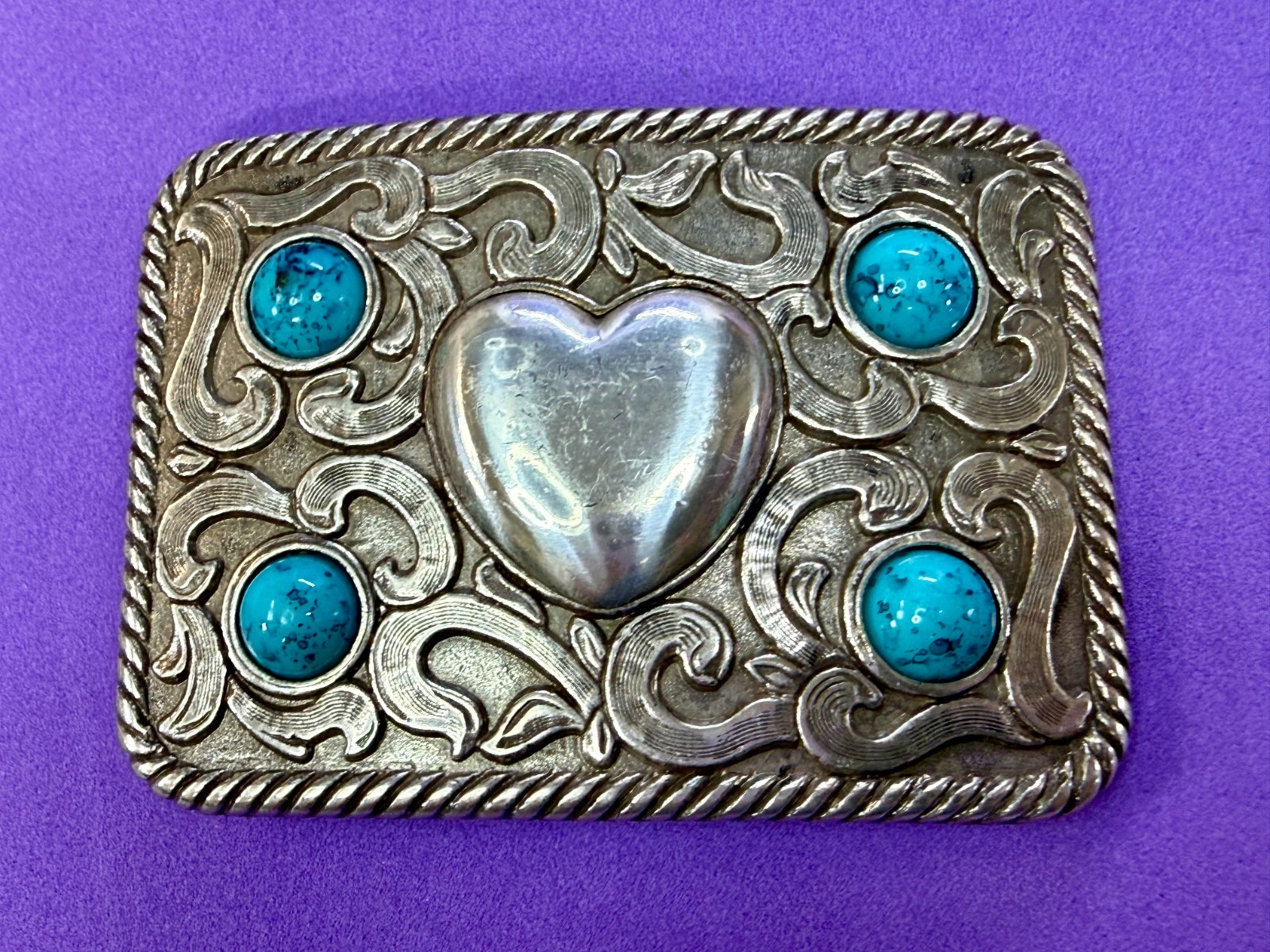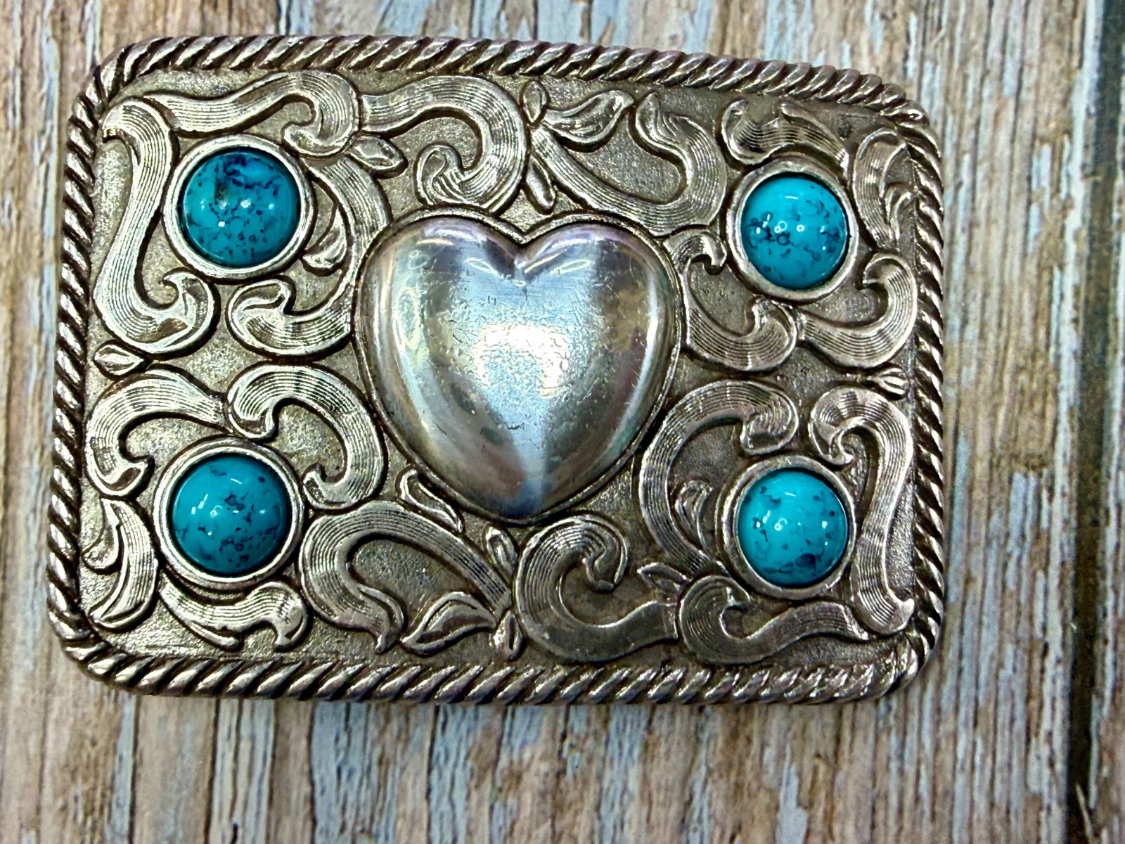 • Centered Heart Shaped Center With Four Turquoise Stone Accents Belt Buckle