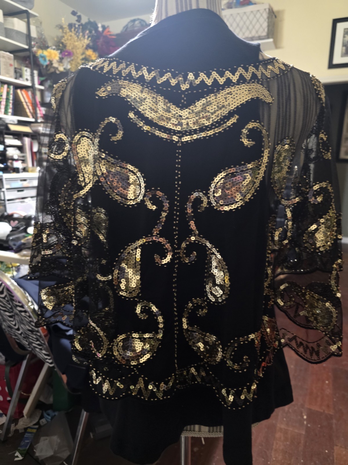 NWOT Sheer Black and Gold Sequins Collar Shoulder Shrug Shawl Applique