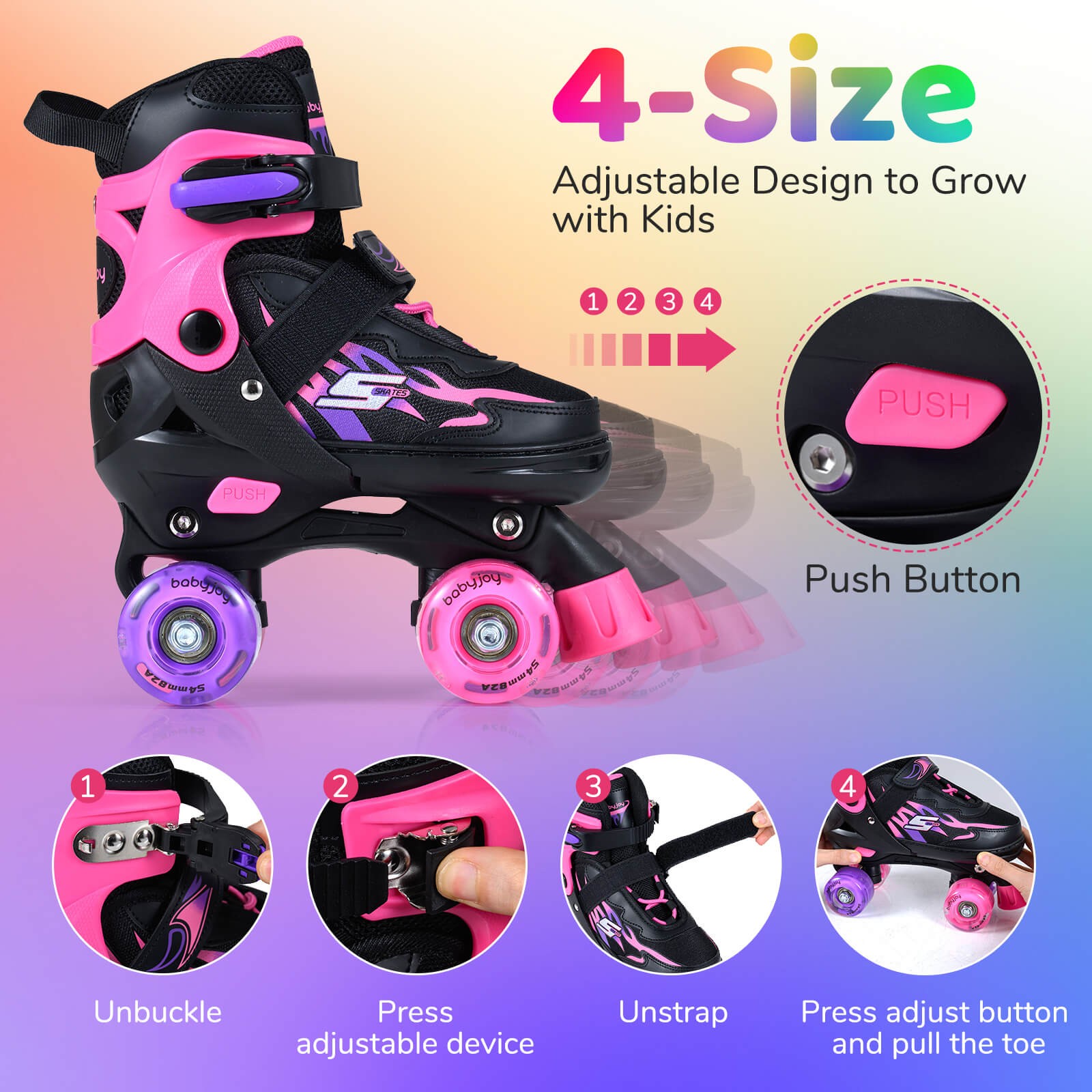 Kids Roller Skates 4 Sizes Adjustable Quad Skates w/Light-up Wheels for Ages 5-7