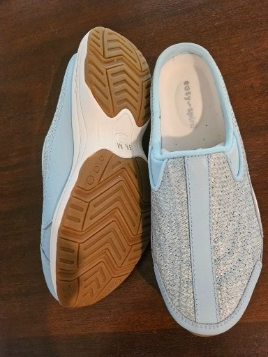 как выглядит Easy Spirit Traveltime Womens 5.5 M Blue Leather Pattern Comfort Clog Mule NEW фото