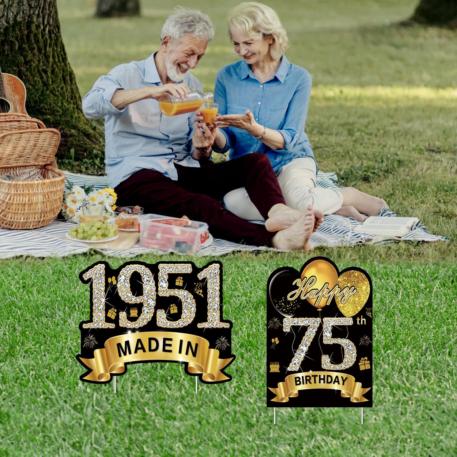 как выглядит 2Pcs Black Gold 75th Birthday Yard Sign Decoration for Men Women,Happy 75th B... фото