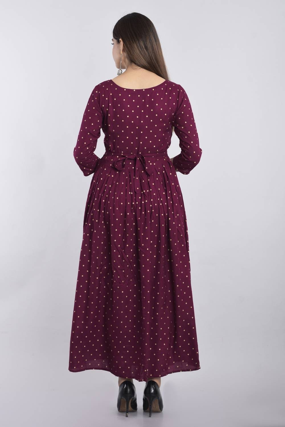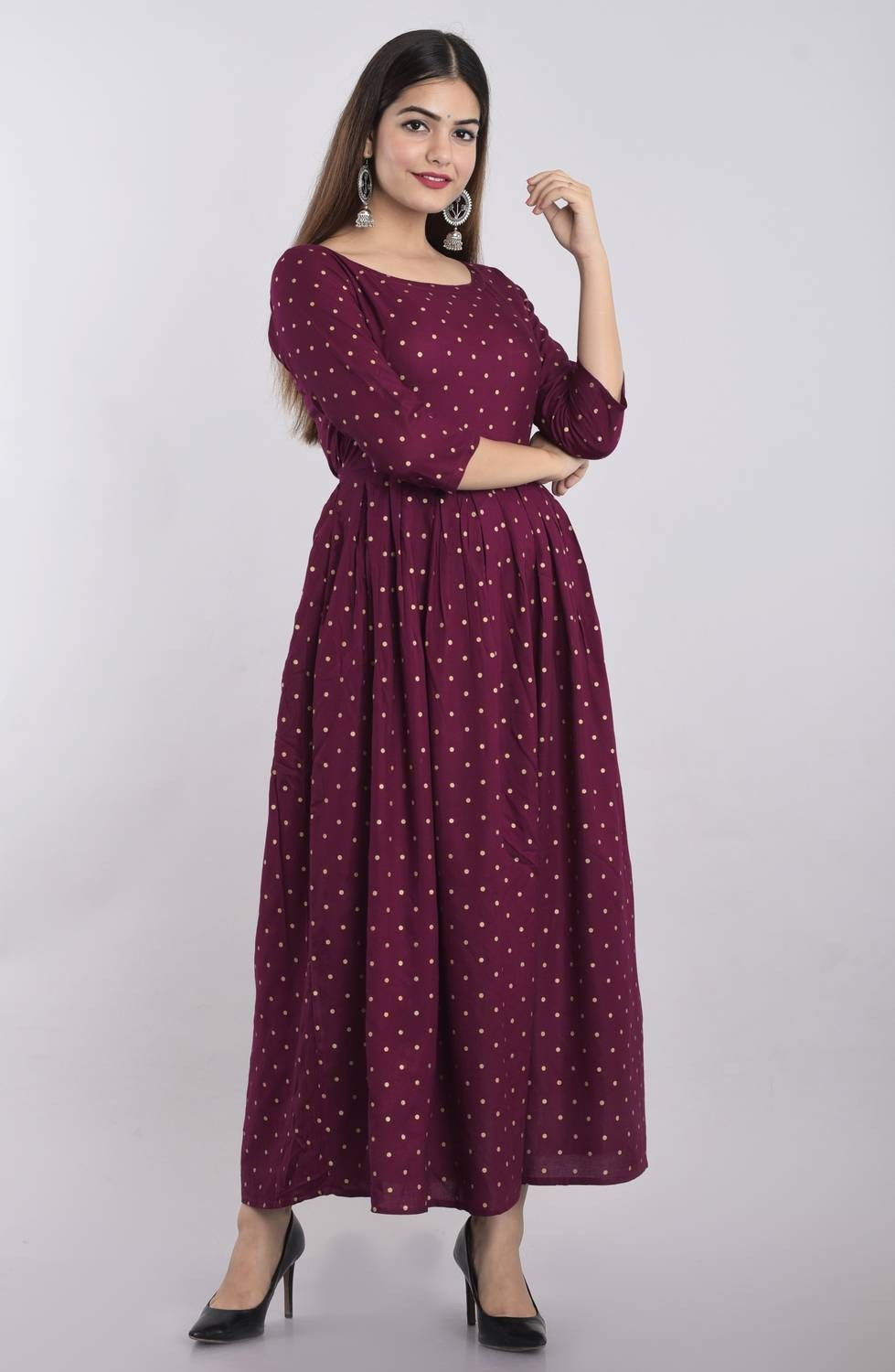 Purple Kurta Women Polka Dot Flared Anarkali Kurti Gown Dress NEW