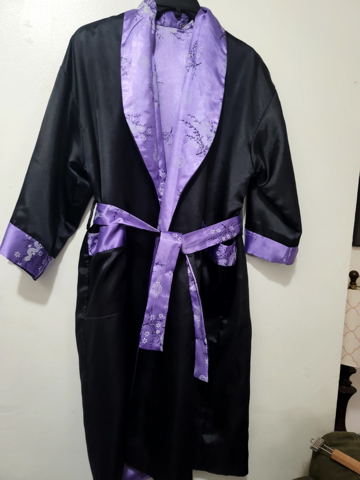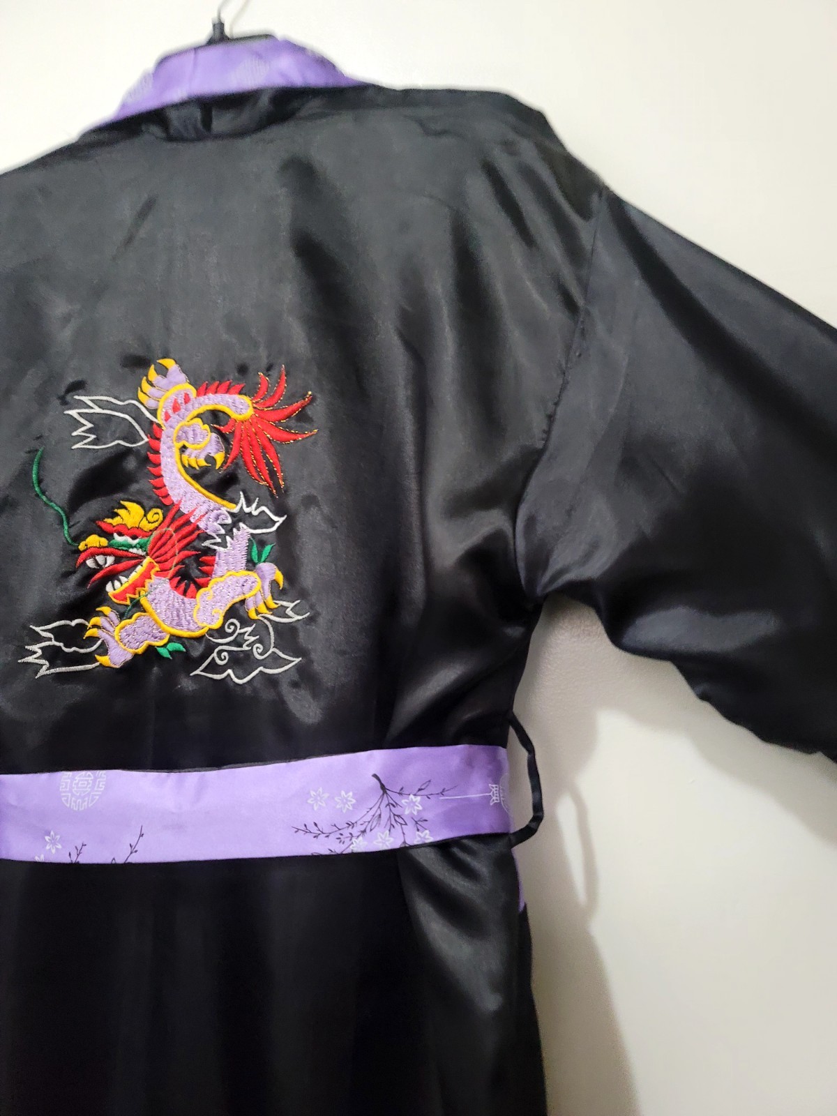 как выглядит Dragon Embroidered Robe Women OS Black Purple Print Satin Kimono Reversible Belt фото