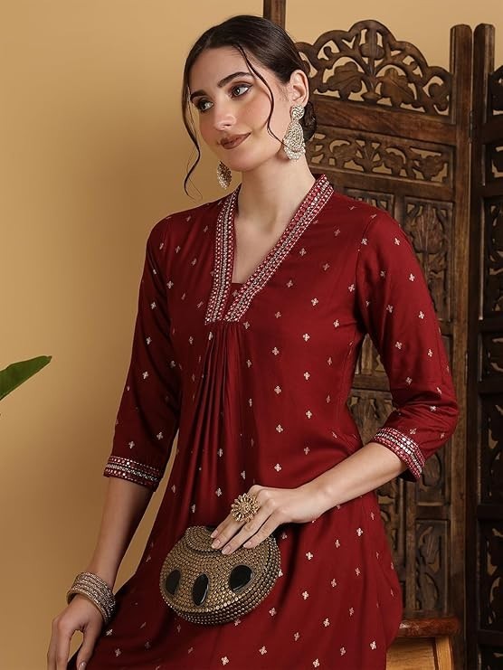 как выглядит Maroon Kurta Women Indian Kurti Calf Length Dress Tunic фото