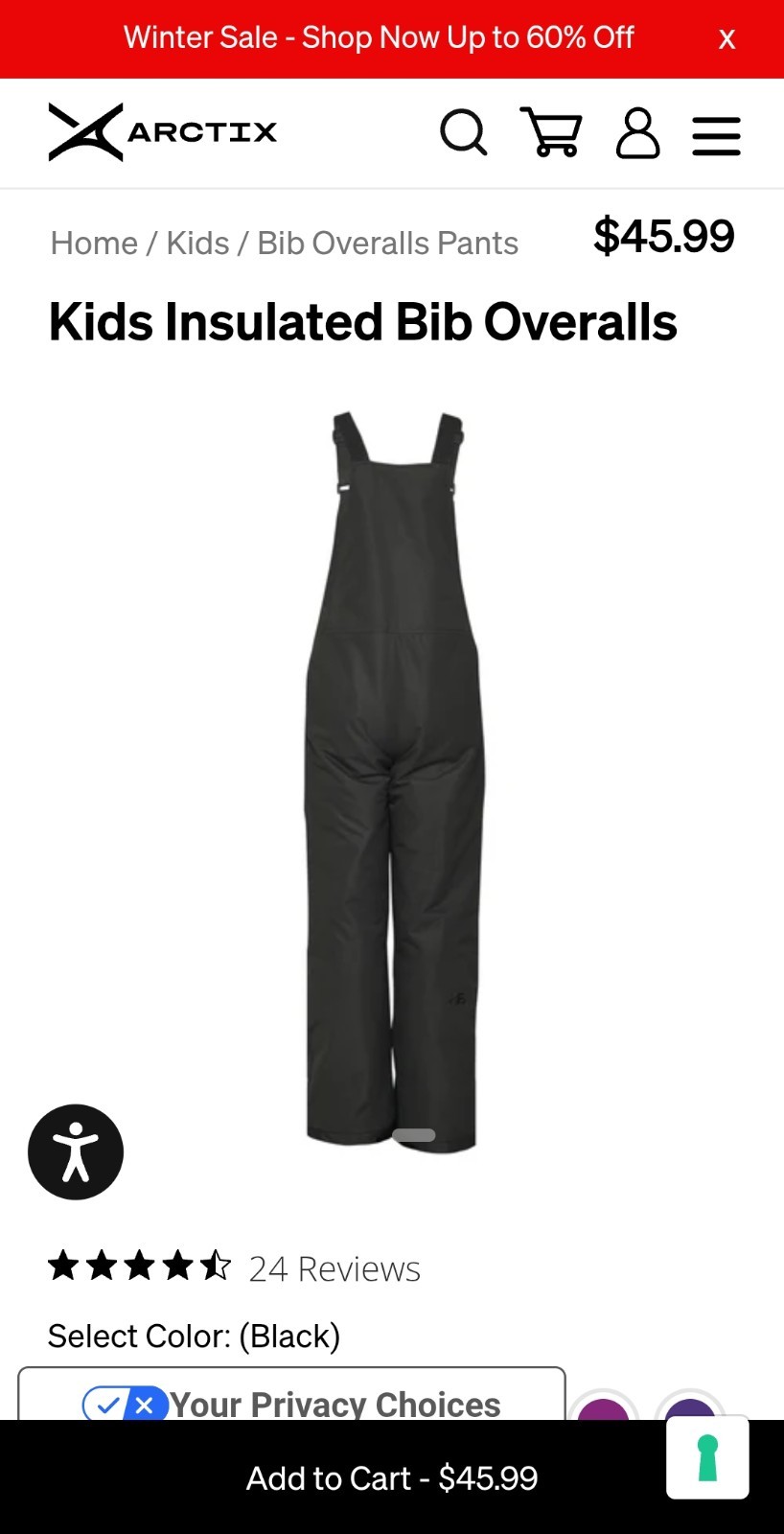 NWT Arctix Kids Black Ski Snow Bib Overalls Pants Small Size 8