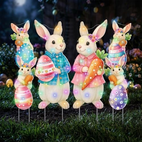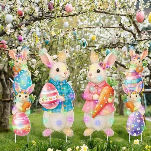 4 Pcs Outdoor Decorations Bunny Yard Stake Signs with LED Light Large Easter