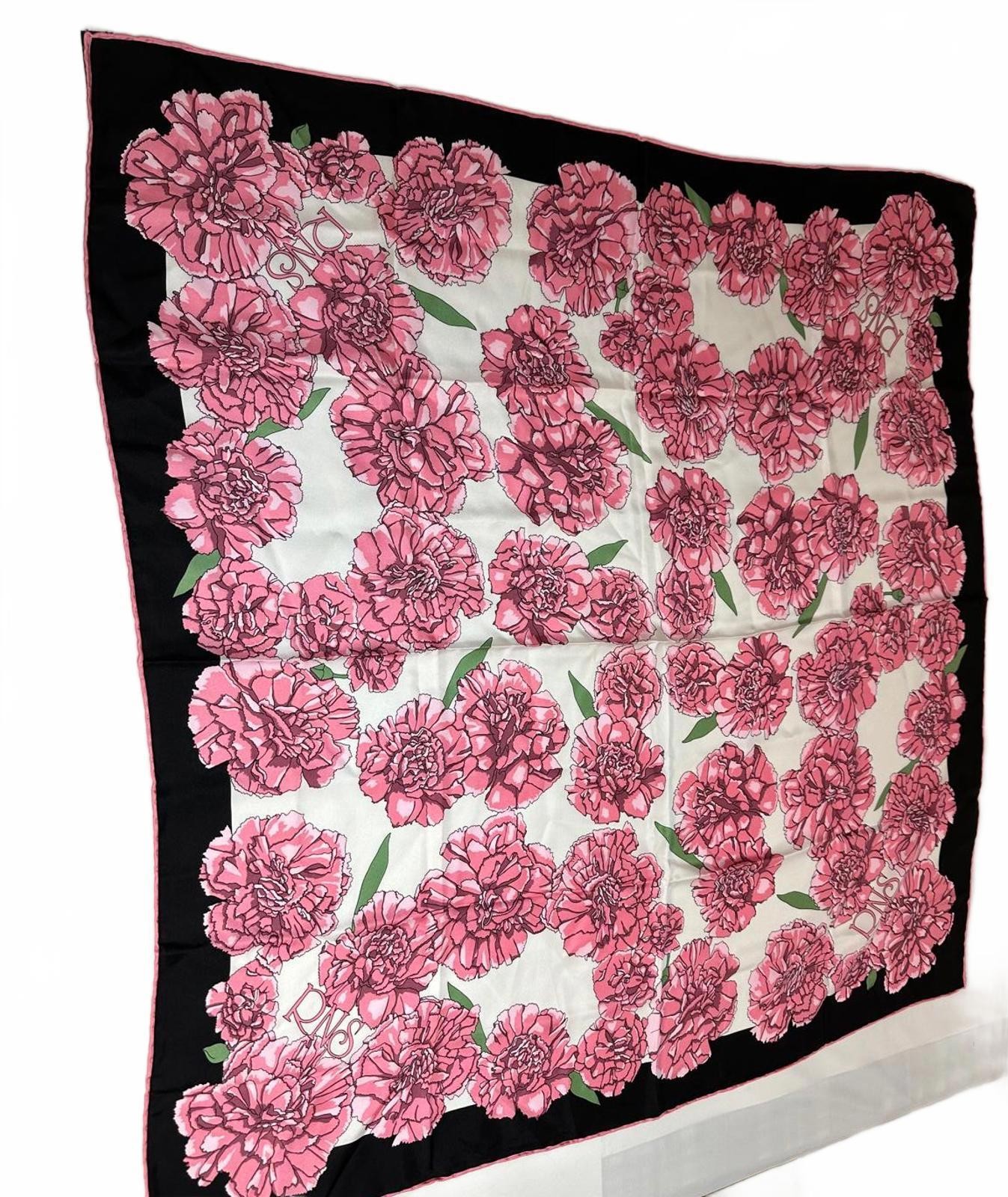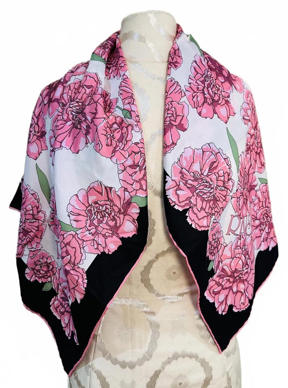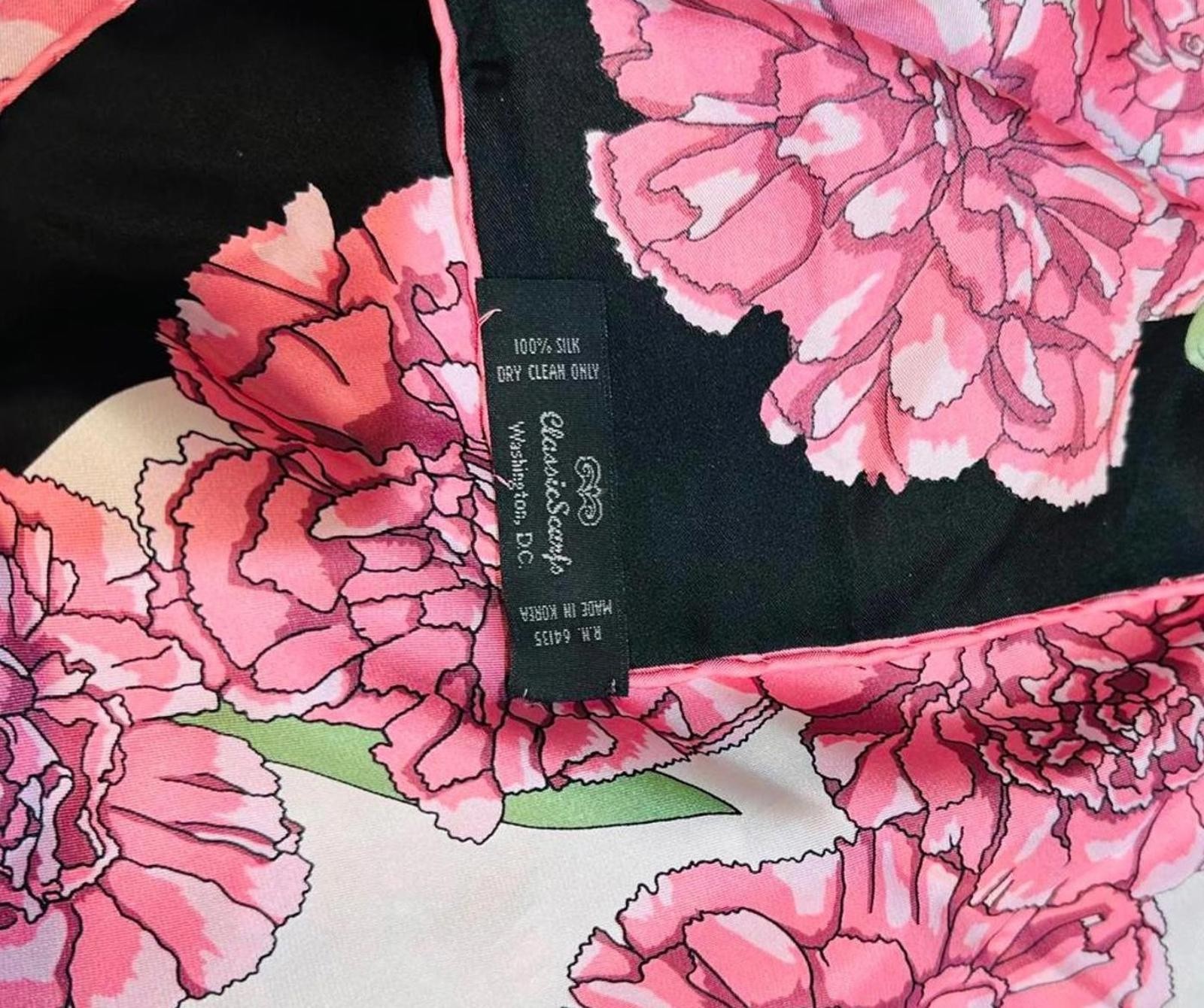как выглядит Vintage 100 SILK Pink Floral Square Scarf w White Background Black Trim RNS фото