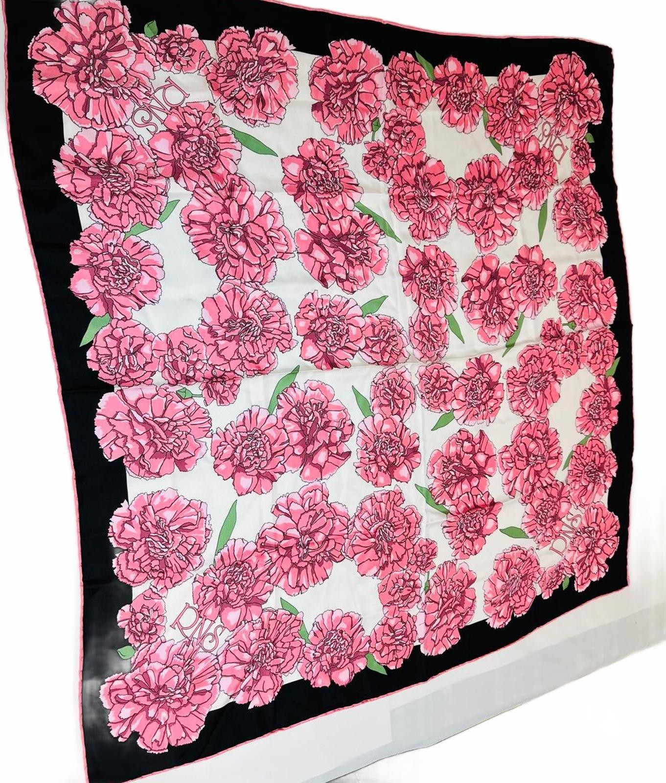 Vintage 100 SILK Pink Floral Square Scarf w White Background Black Trim RNS