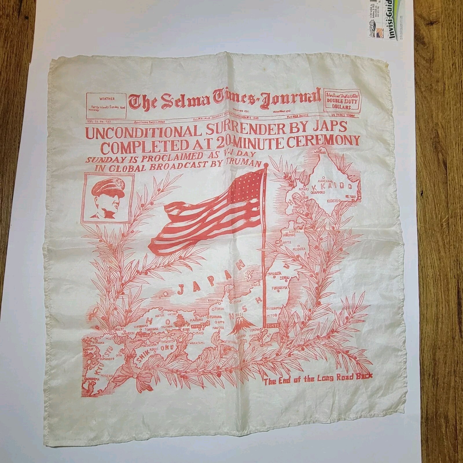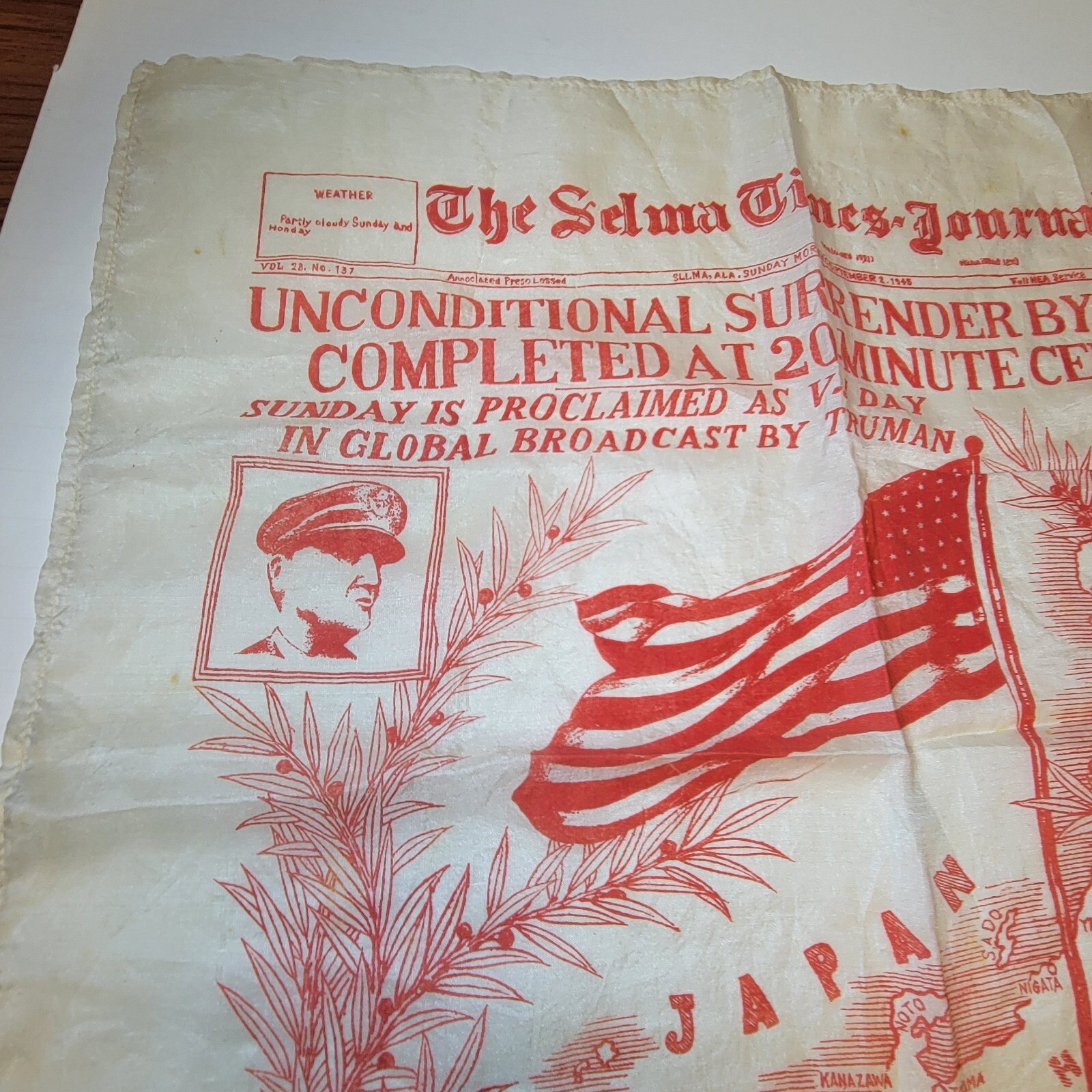 Selma Times Journal USA WWII V-J Day Silk Scarf Sept 2 1945 RED