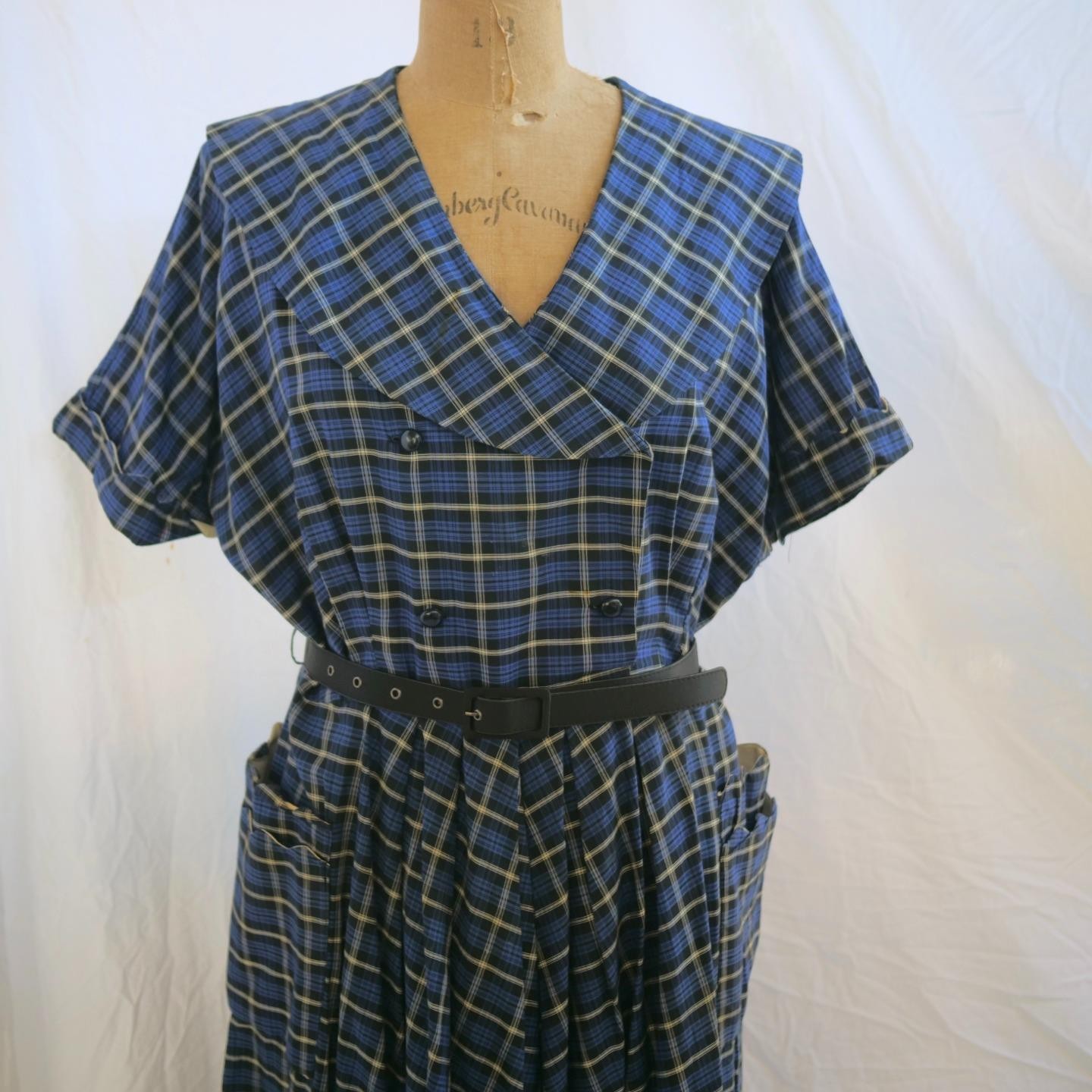 Vtg 50s BEA YOUNG Blue Plaid Shirtwaist Full Cotton Swing Dress Rockabilly 22