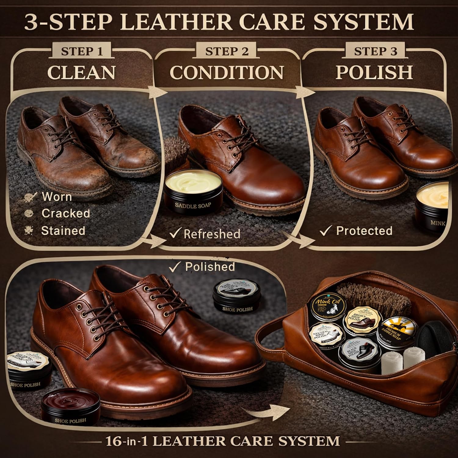 Shoe Care Kit 16-In-1 Leather Shoe Polish, Cleaning Conditioning Kit with Sa