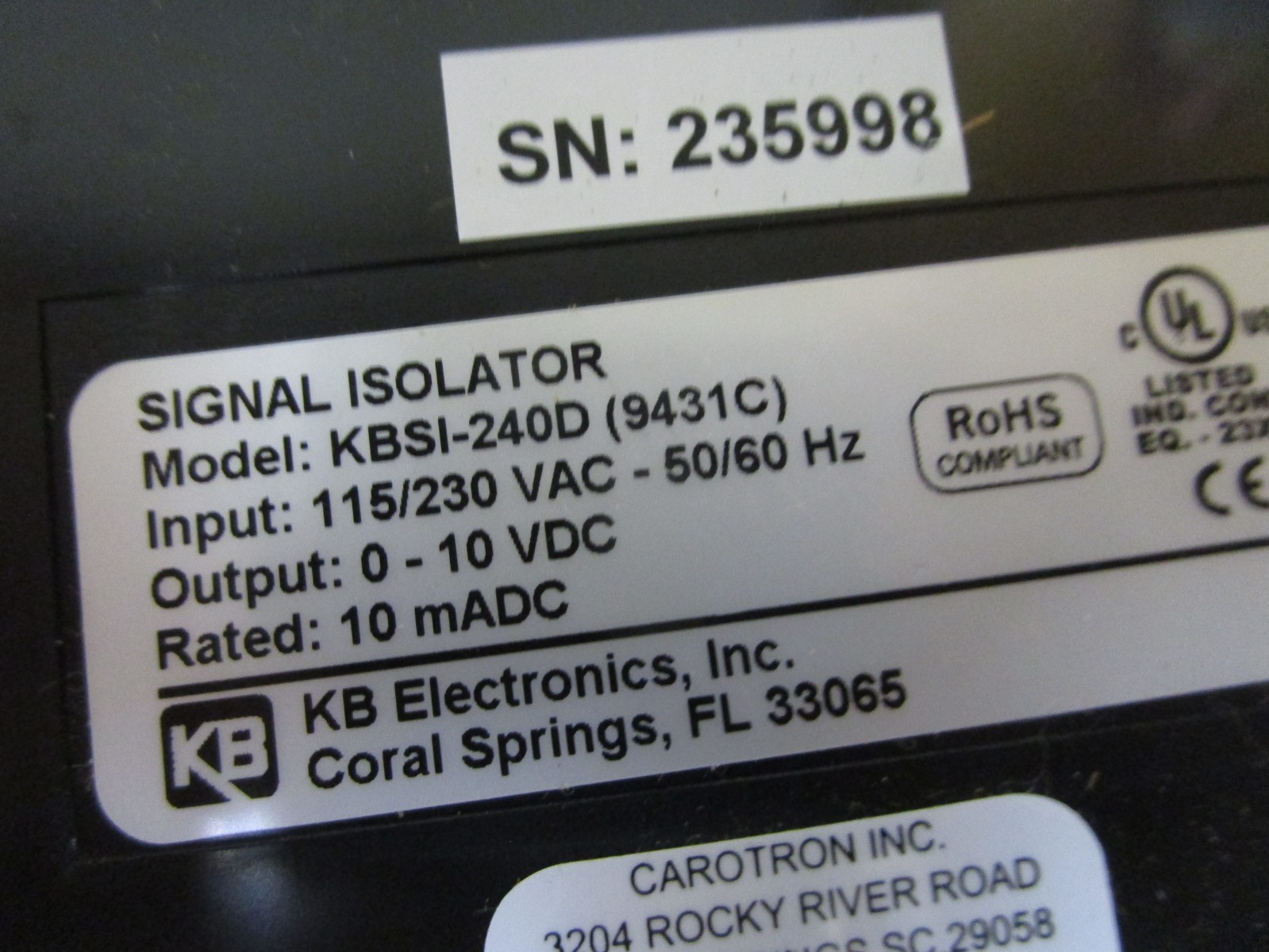 KB Electronics KBSI-240D 9431C Signal Isolator 115/230Vac 10mADC 0-10Vdc