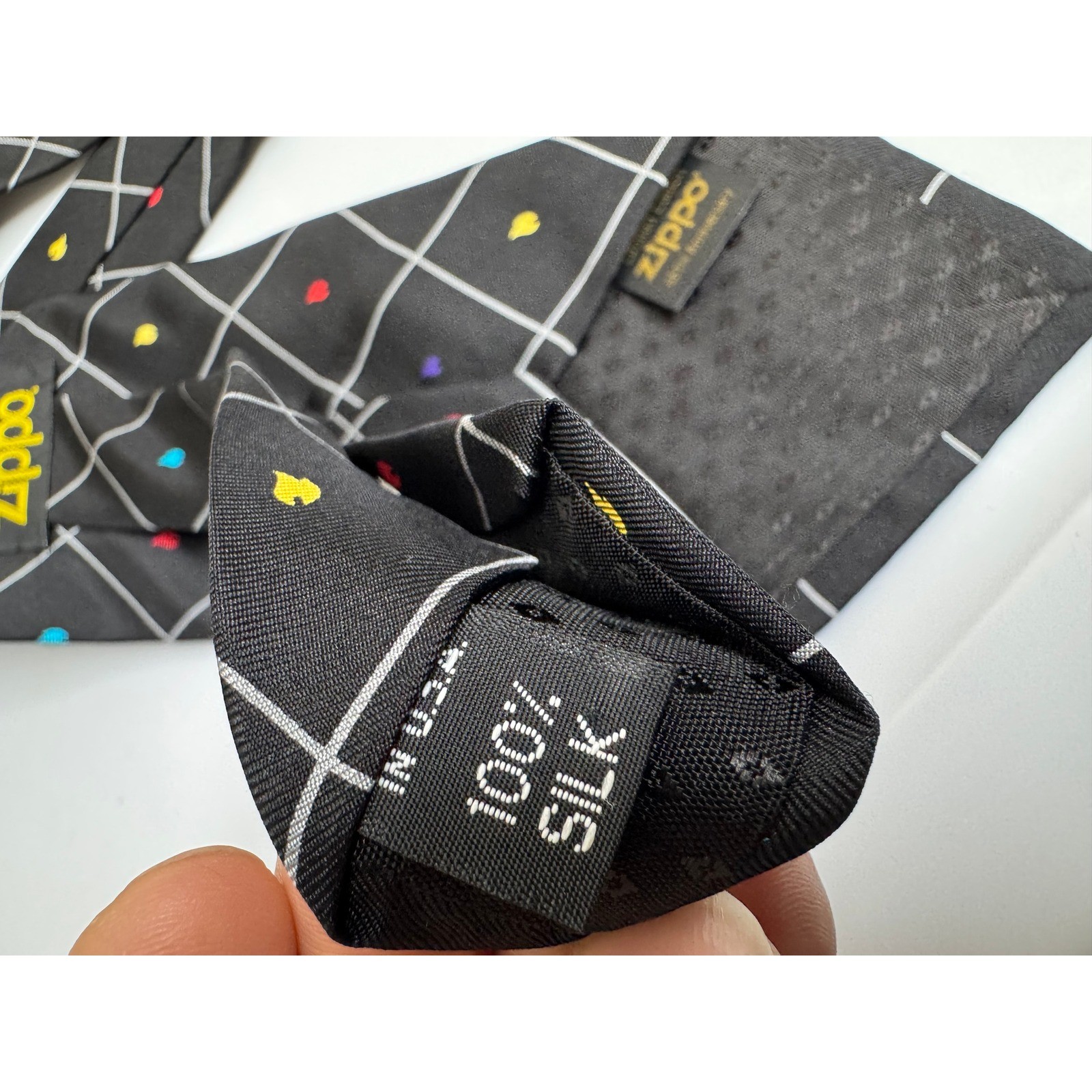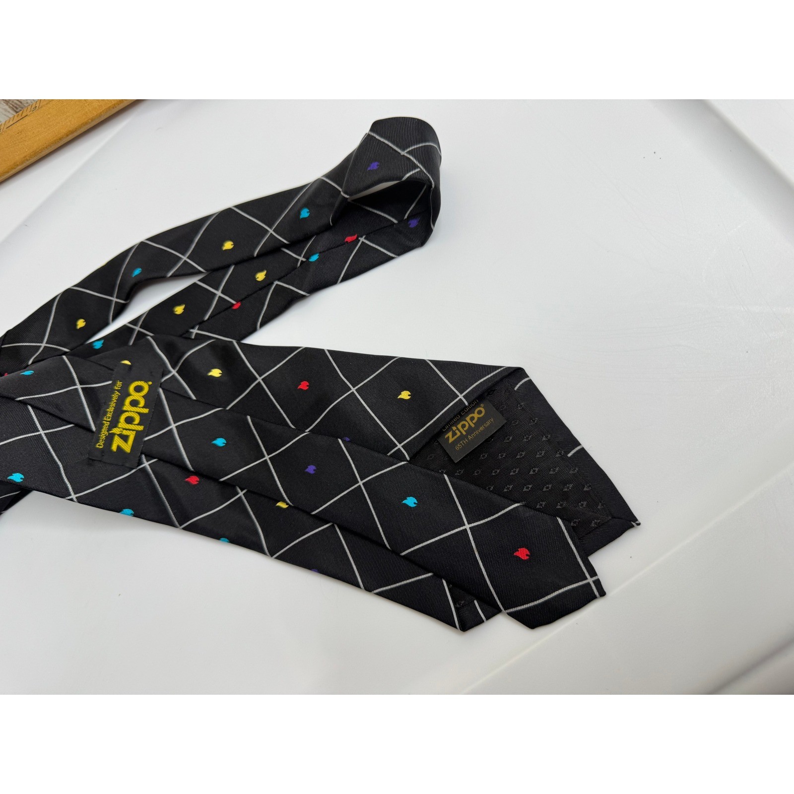 Vtg Zippo 65th Anniversary Silk Necktie Black Diamond Pattern Flame Accents Mens