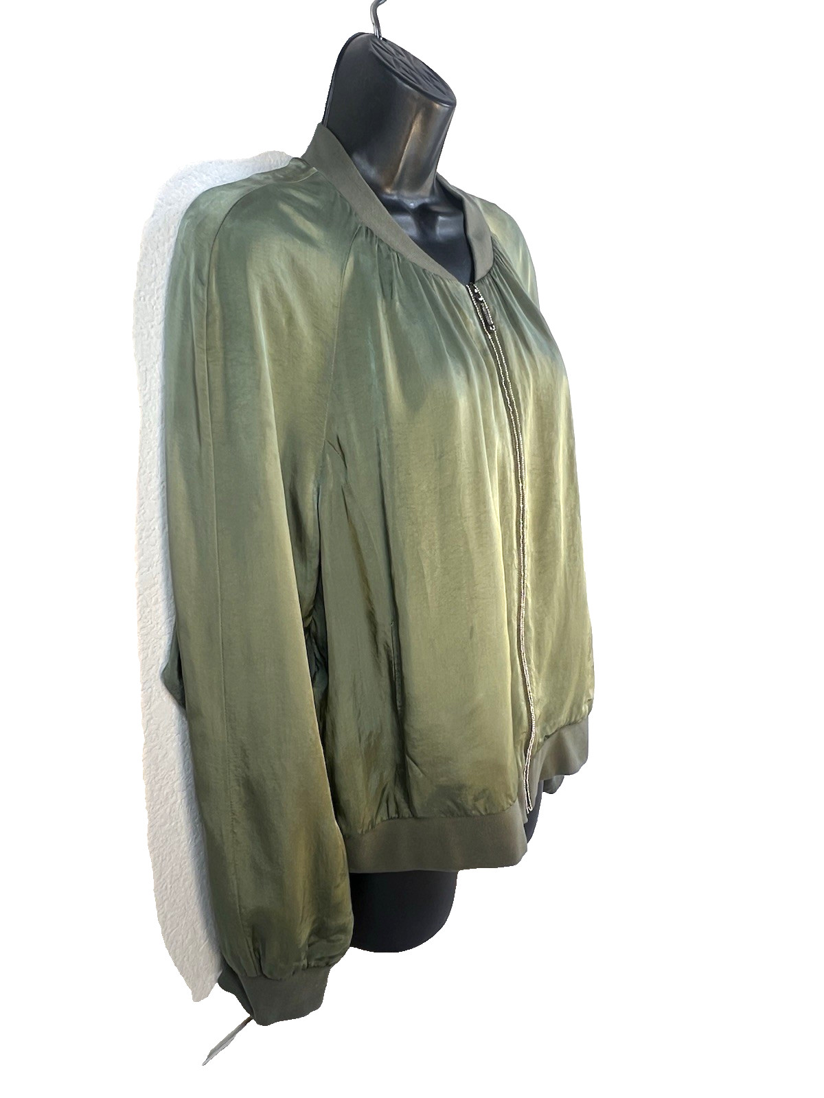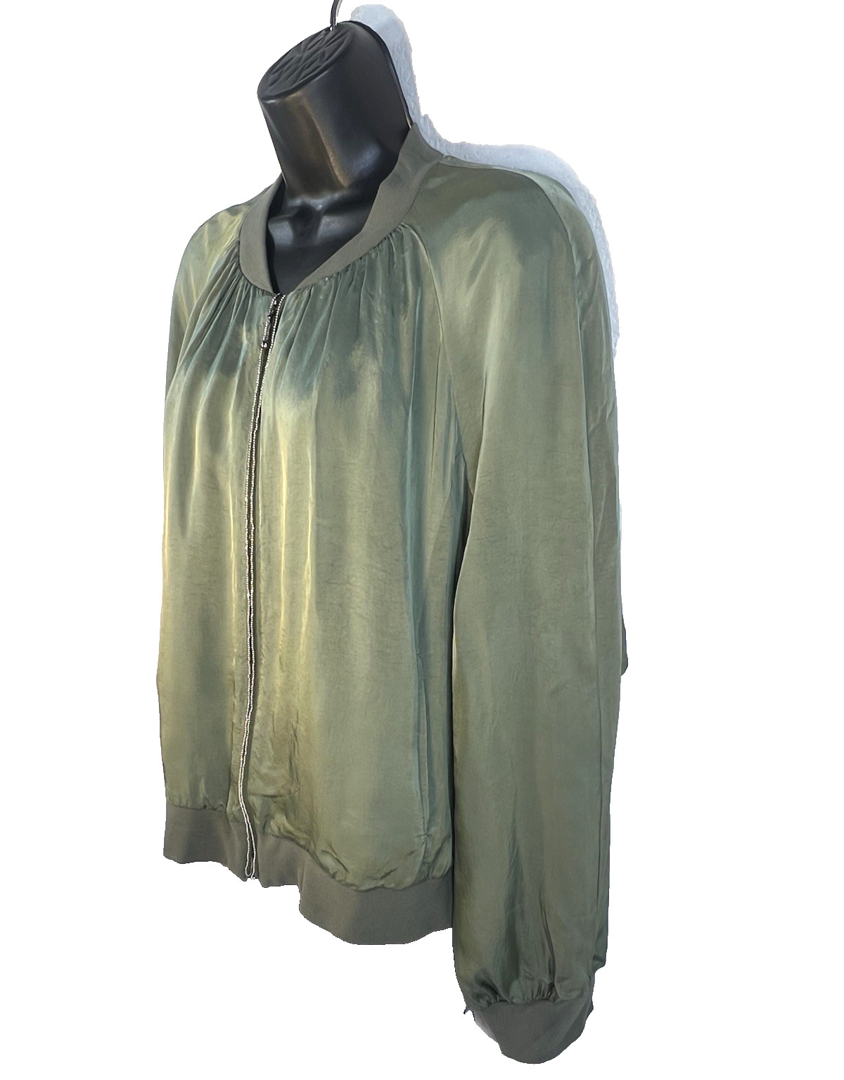 vtg ST JOHN Black Lable Silk Bomber Jacket Green Beaded With Ruffle in Back sz M