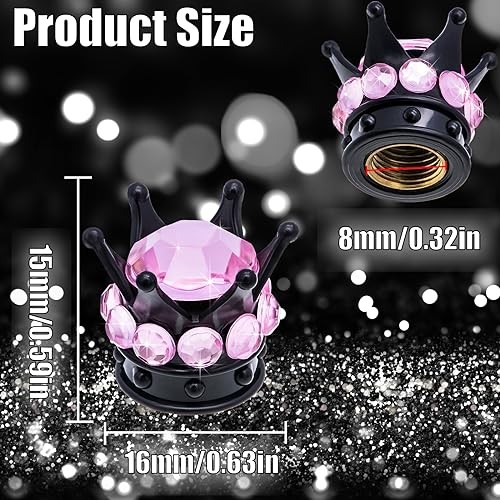 4PCS Crown Bling Tire Stem Valve Caps, Crystal Diamond Car Wheel Black Pink