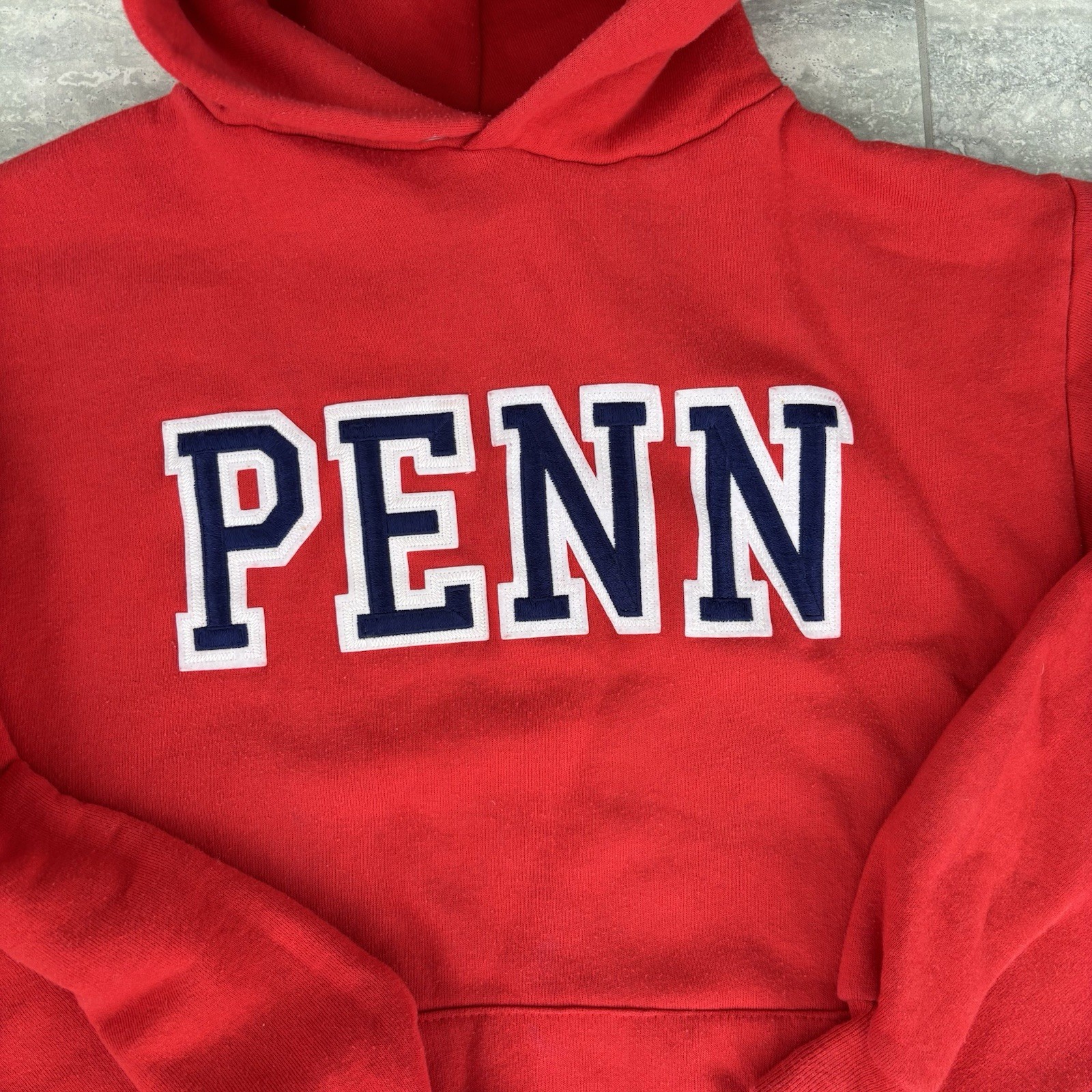как выглядит Vtg Red Embroidery Pach Penn Hoddie Medium 38-40 Super Weights By Russell фото