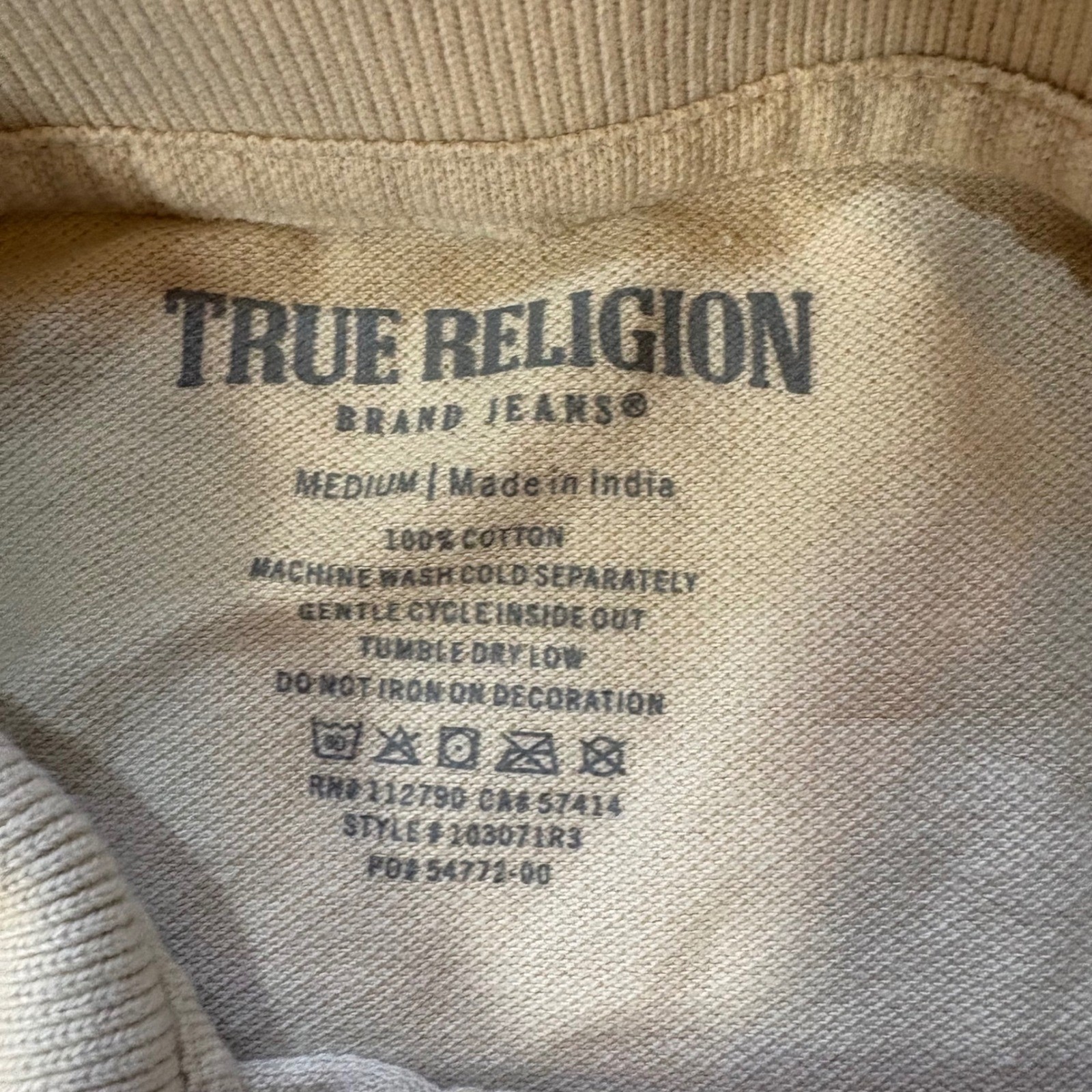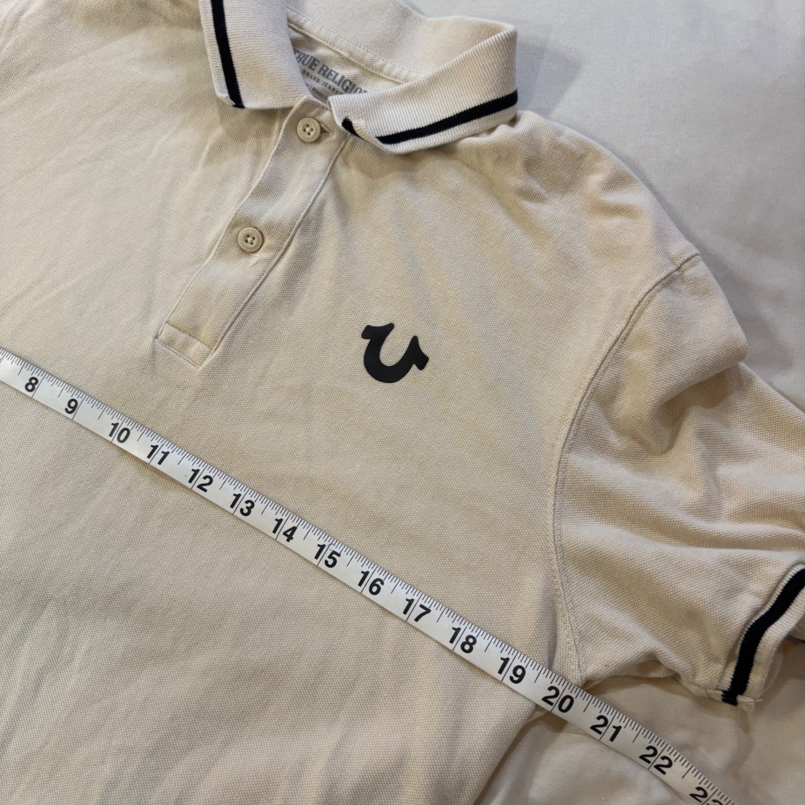 как выглядит True Religion Polo Shirt Mens Medium Cream Black Trim Short Sleeve Logo Golf фото