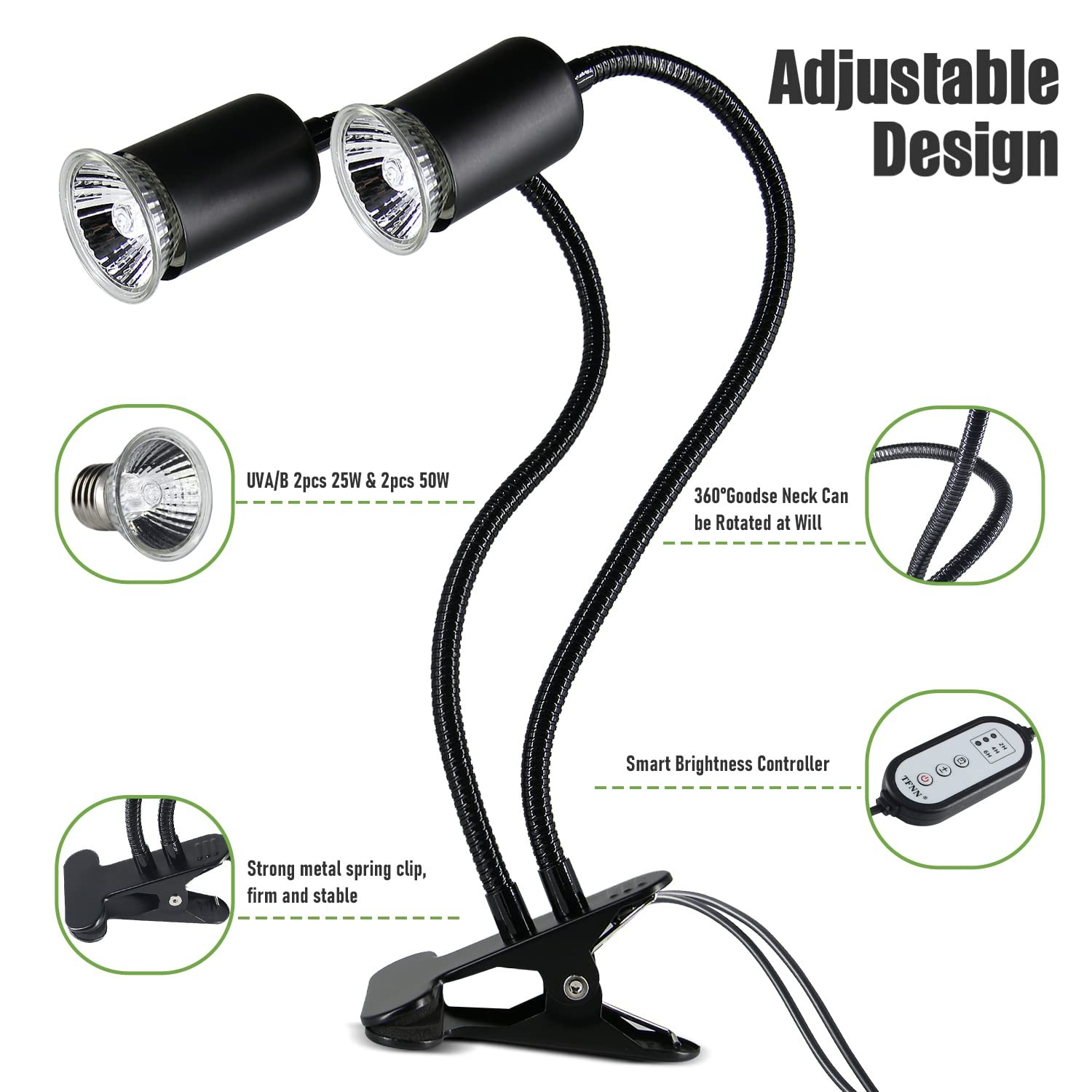 Double-Head Reptile Heat Lamp with Clamp, UVA UVB Light and Timer, 2 Bulbs