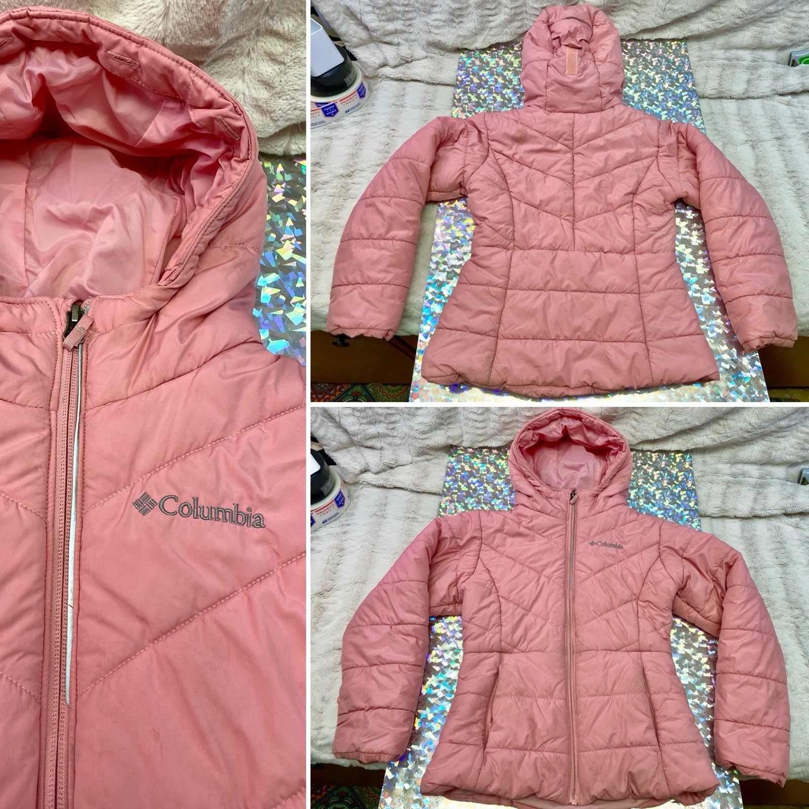 как выглядит Columbia Girls Puffer Hooded Jacket Coat Pink Insulated Winter SMALL 7-8 FLAWS фото