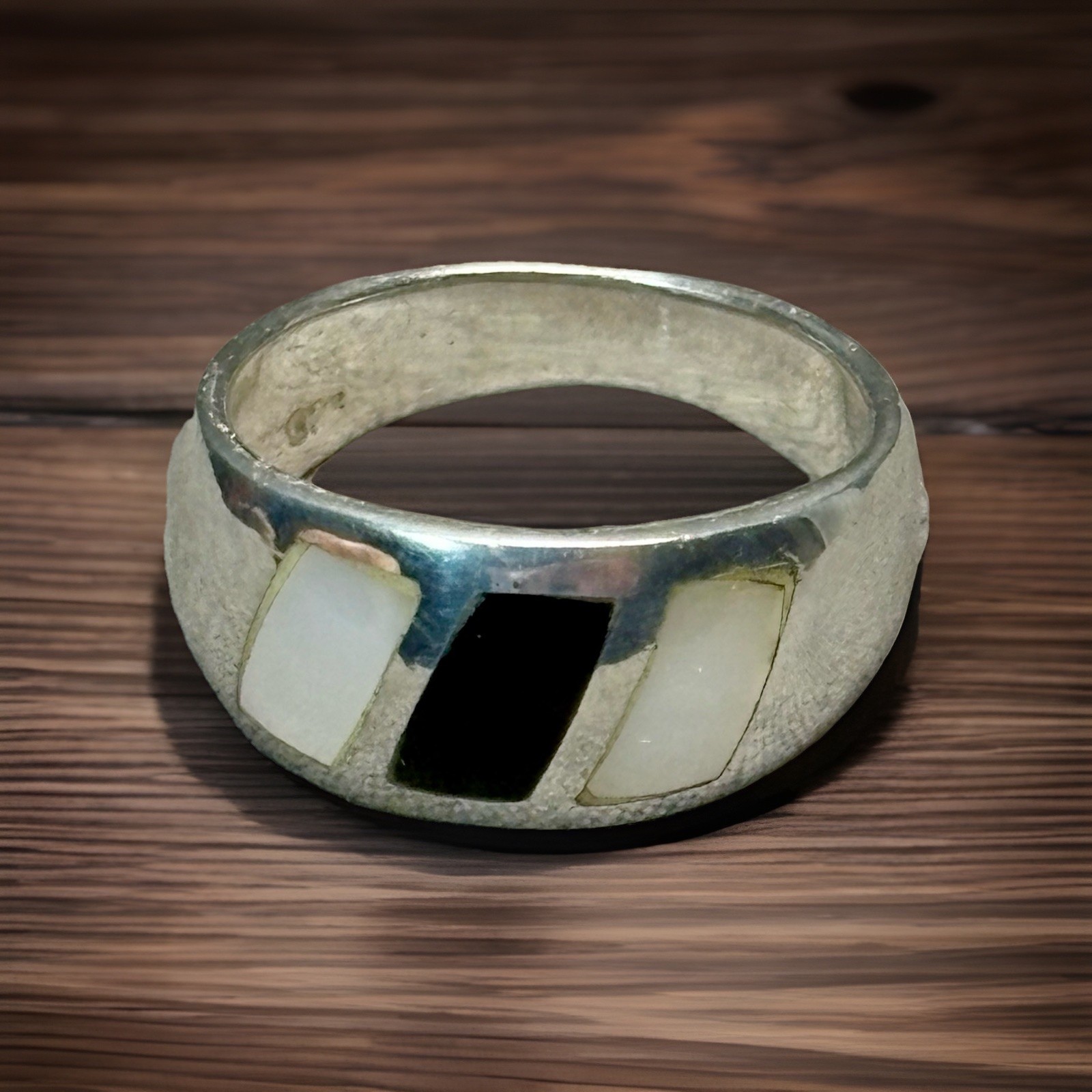 Sterling Silver Black Onyx Mother of Pearl Inlay Band Ring Sz8