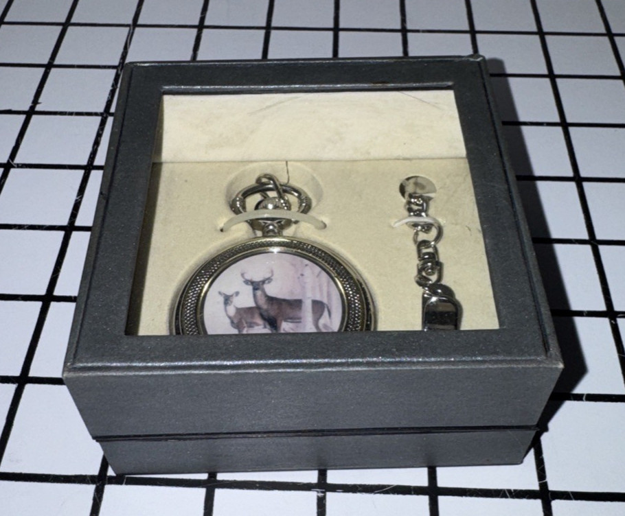 Vintage Standing Buck Deer Doe In Woods Pocket Watch - NEW