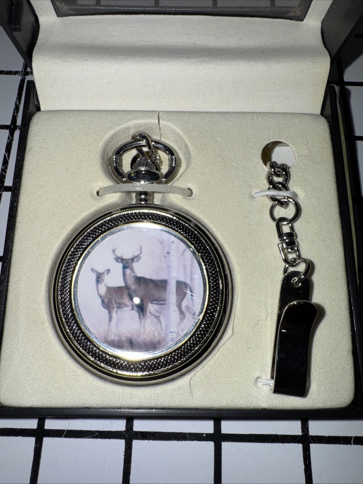 как выглядит Vintage Standing Buck Deer Doe In Woods Pocket Watch - NEW фото