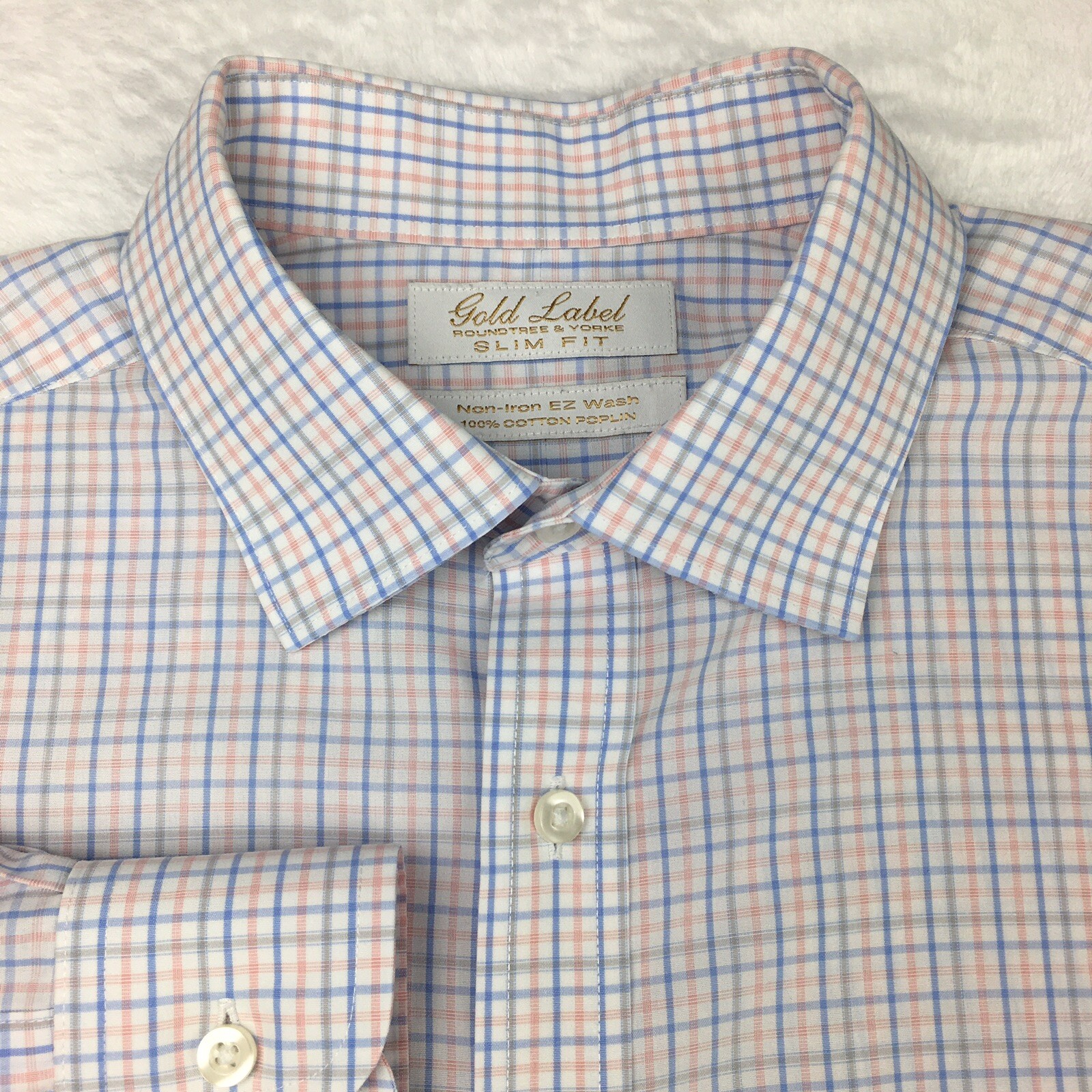 как выглядит Roundtree Yorke Gold Label Dress Shirt Mens 15.5-32 Pink/Blue Check Slim Fit фото