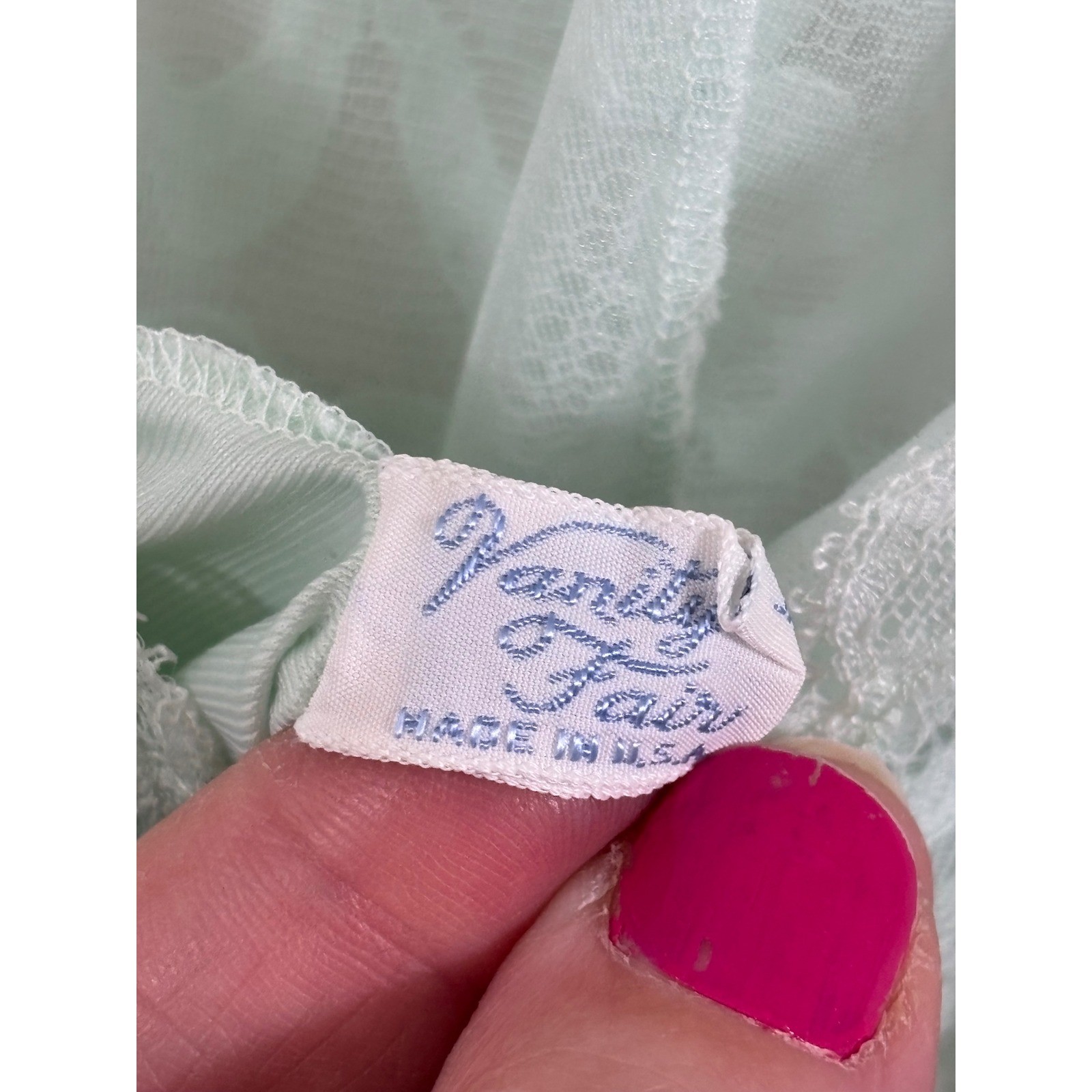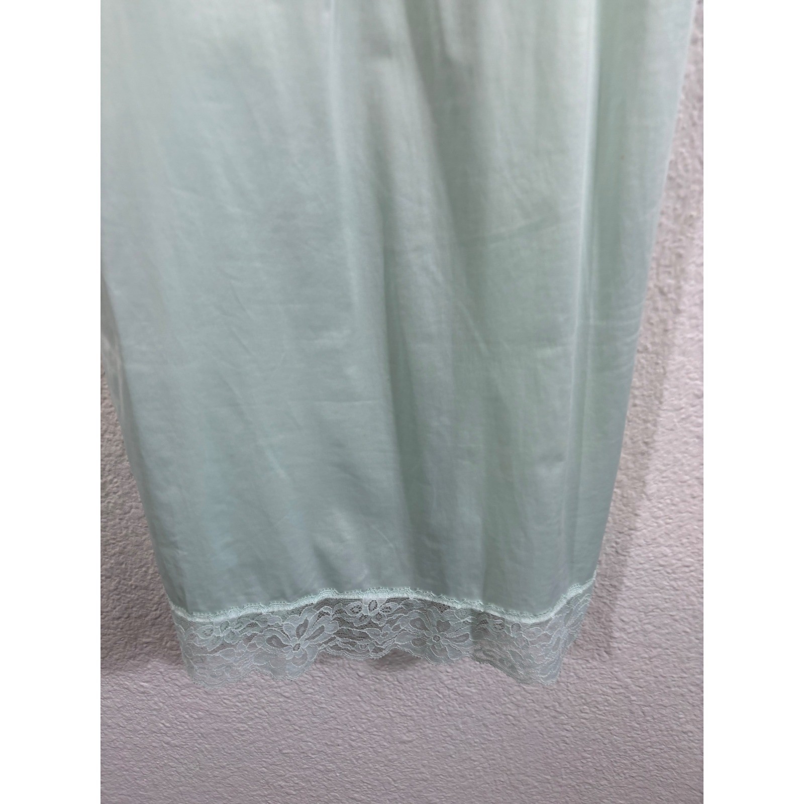 как выглядит Vintage Vanity Fair Mint Green Lace Trim Slip Dress Nightgown Made in USA 32 фото