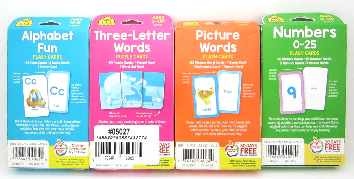 School Zone Flash Cards 4 Pack Alphabet, 3 Letter Words, Picture Words, Number