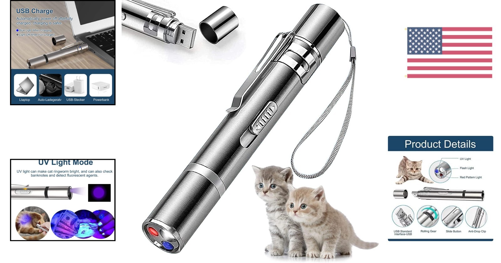 Особенности: Interactive, Metal clip design, Three adjustment modes, Mini size, Easy to carry, Scroll black gear on head, Purple light for counterfeit currency checking, Indoor play, USB direct charging, Environmentally friendly, Great gift for pets