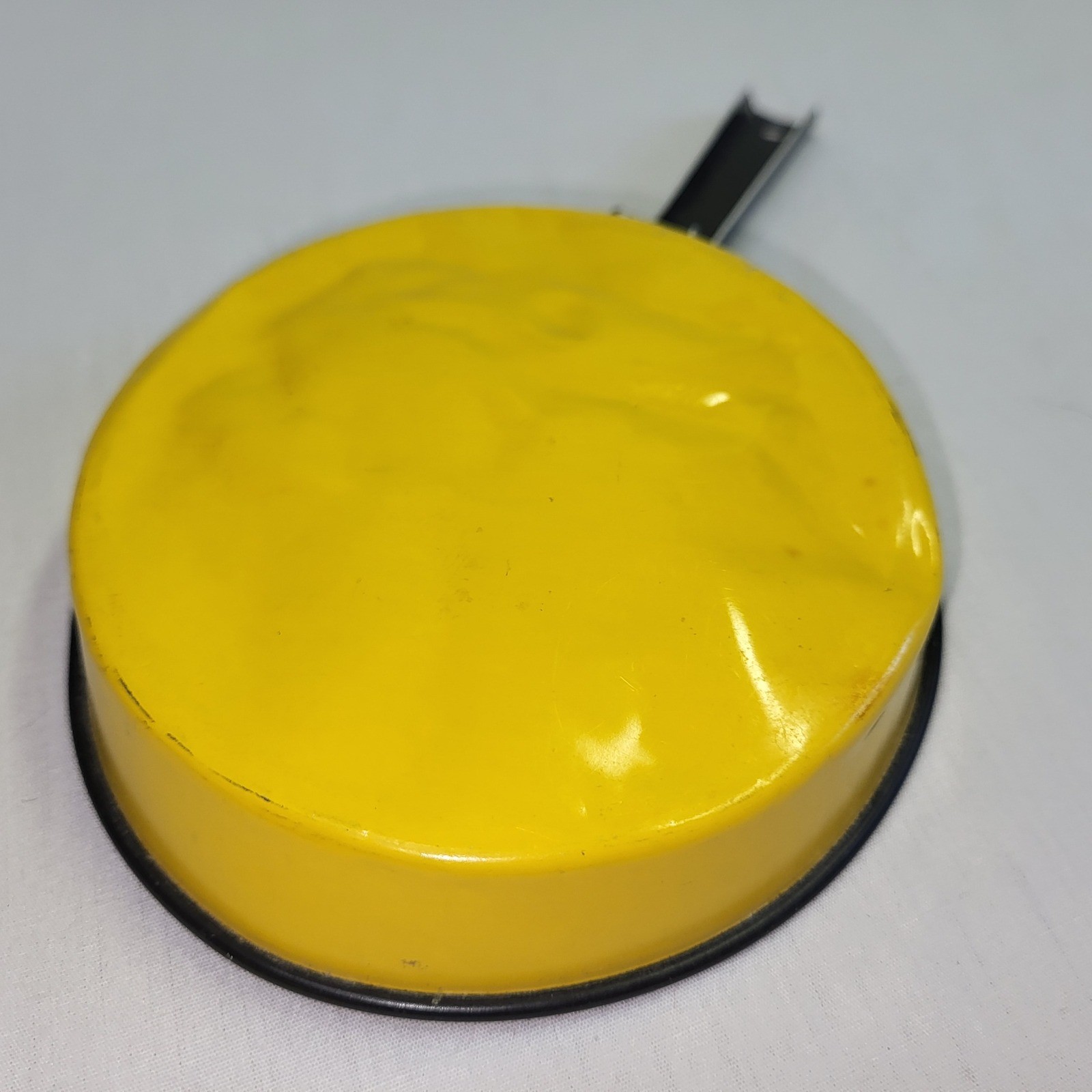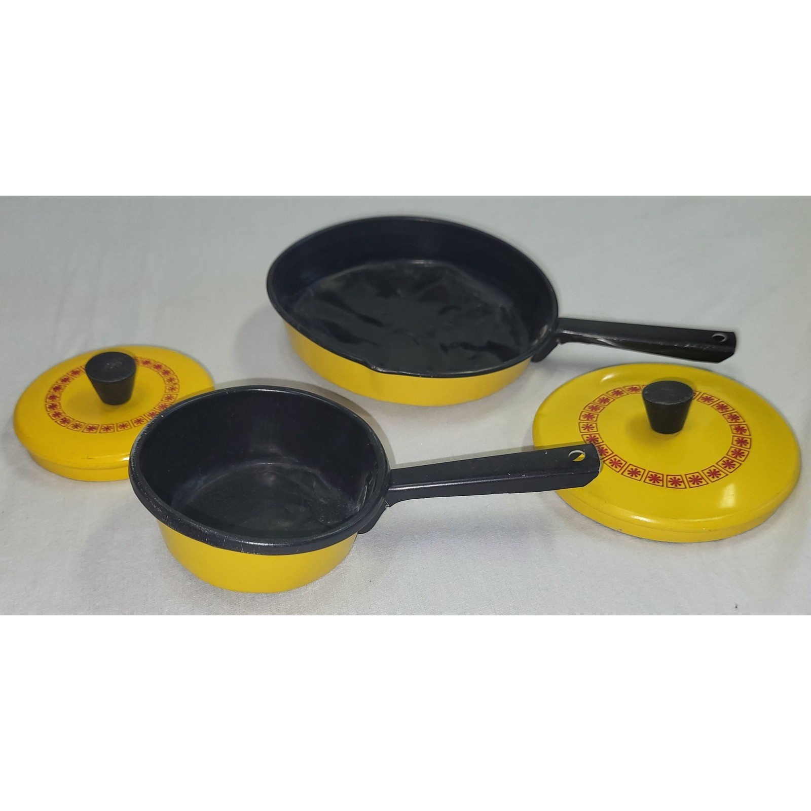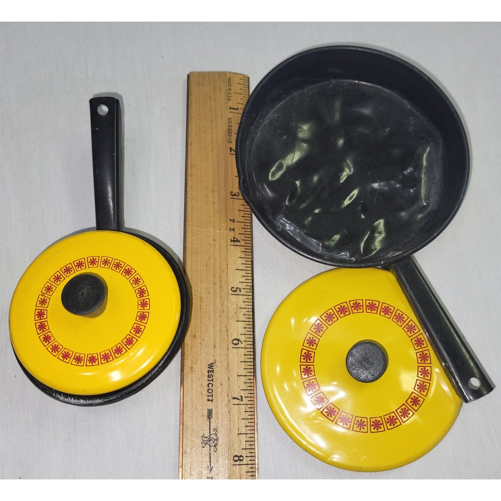 Vintage 1970s Tin Litho Toy Pot Pan Set Kids Yellow Mid Century Kitchen Play
