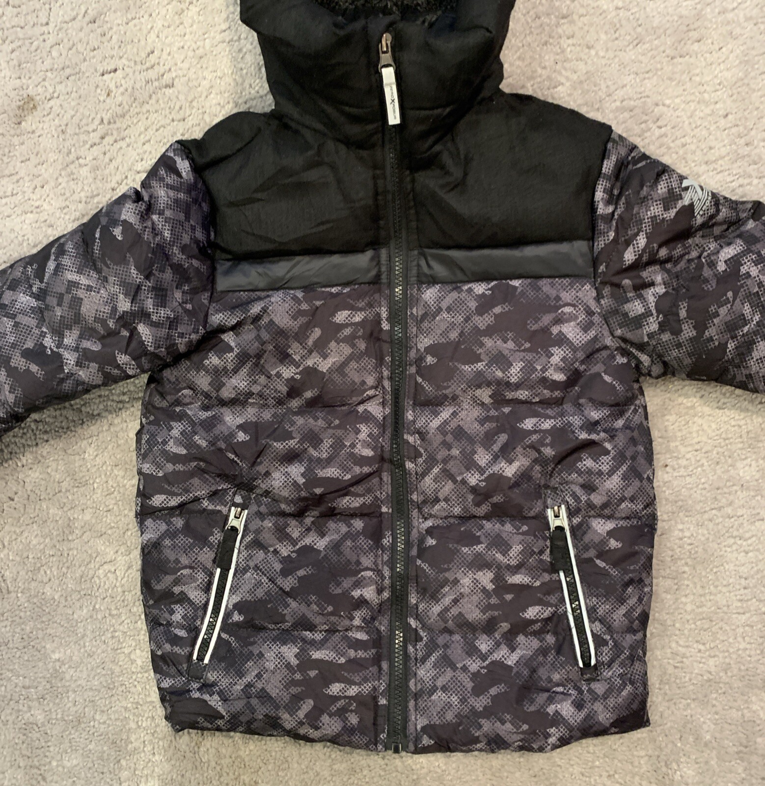 как выглядит Zero Xposure Boys Black And Gray Camouflage Winter Coat With Hood Size 5/6 фото