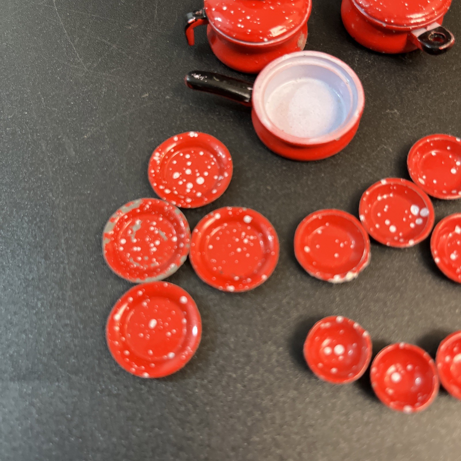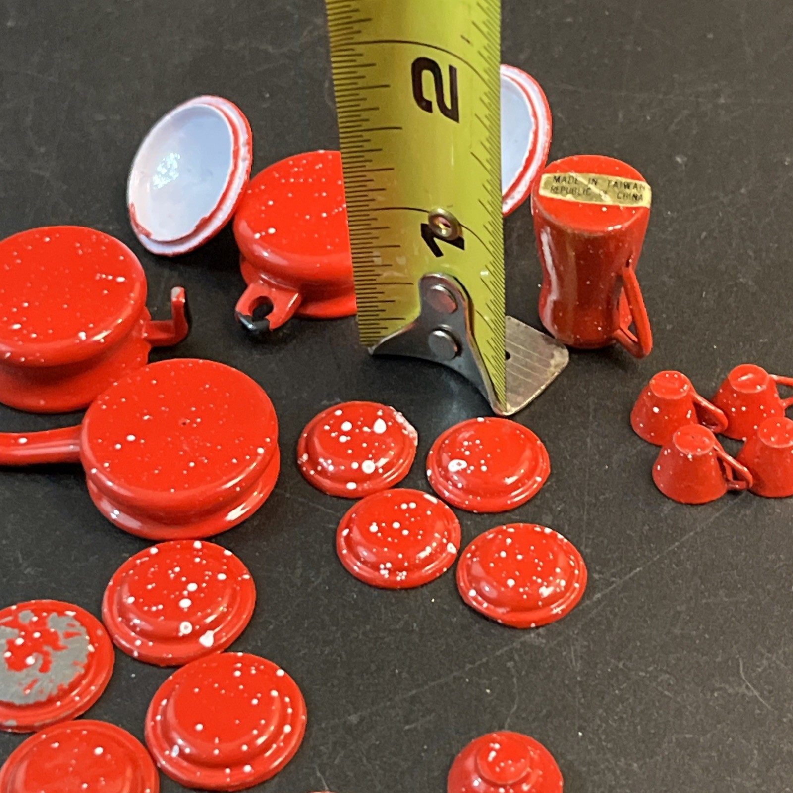 19 Piece Vtg Miniature Doll House Red White Speckled Enamel Cookware Camping Set
