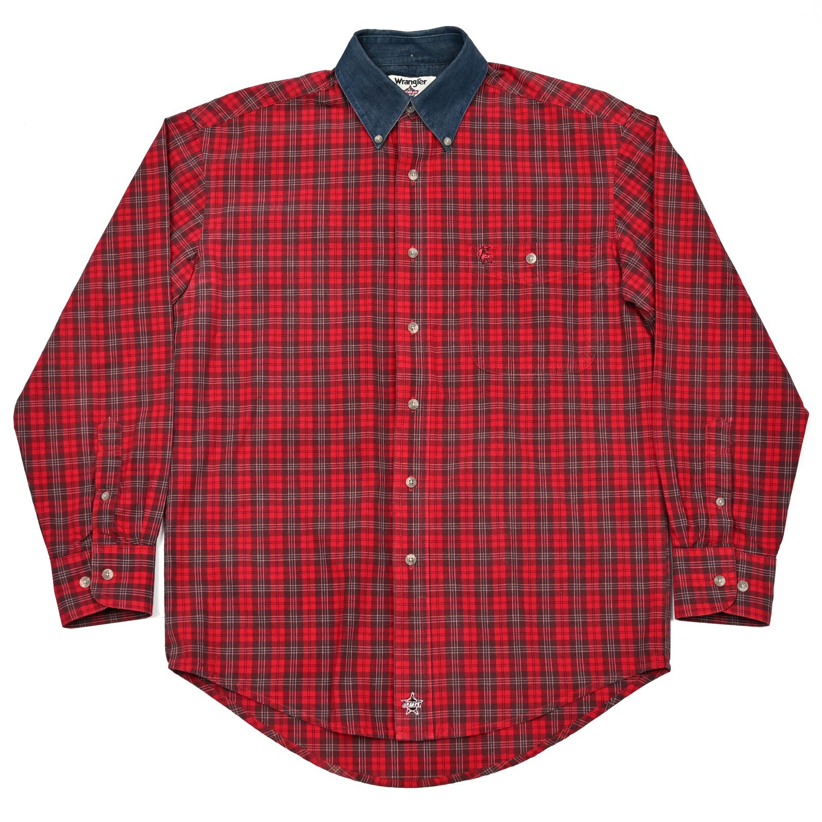 Wrangler PBR Western Shirt Men's Medium Red Plaid Pocket Denim Collar Vintage