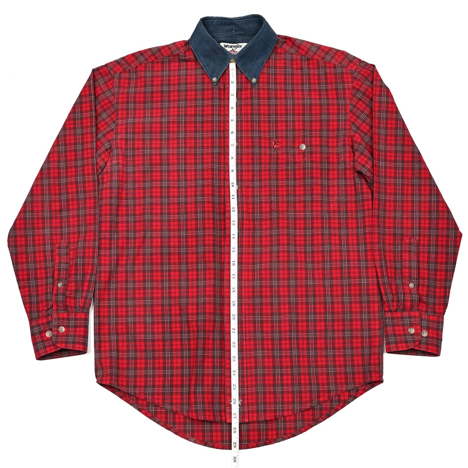 как выглядит Wrangler PBR Western Shirt Mens Medium Red Plaid Pocket Denim Collar Vintage фото