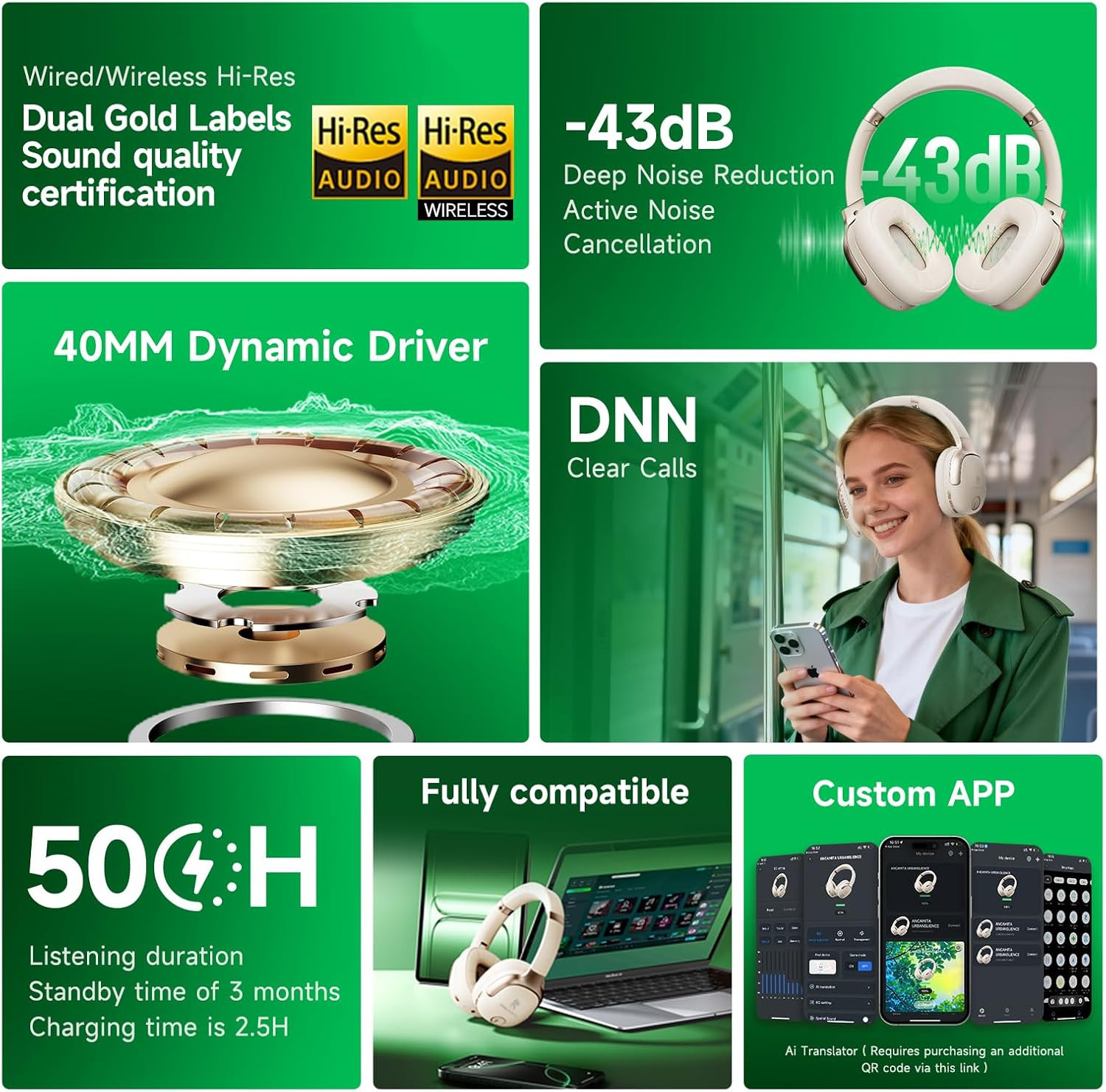 Premium Over-Ear Active Noise Cancelling Headphones: 45Db ANC, 50H Playtime, Met